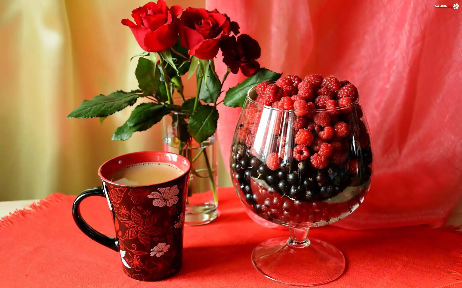 Bukiet, Róż, Kubek, Kawa, Maliny, Porzeczki - Zdjęcia