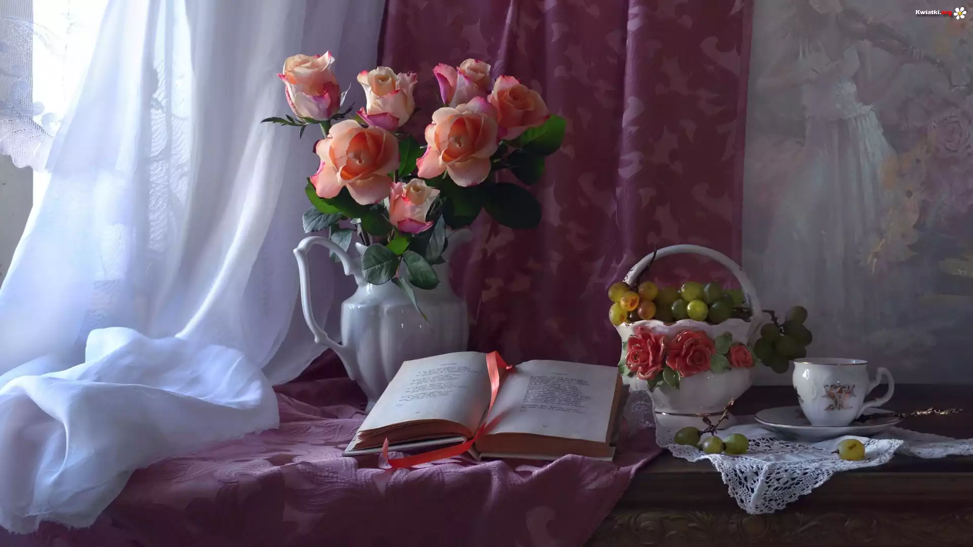 Kwiat Dzbanek, Bukiet, Róże, Koszyczek, Winogrona, Filiżanka, Książka, Okno