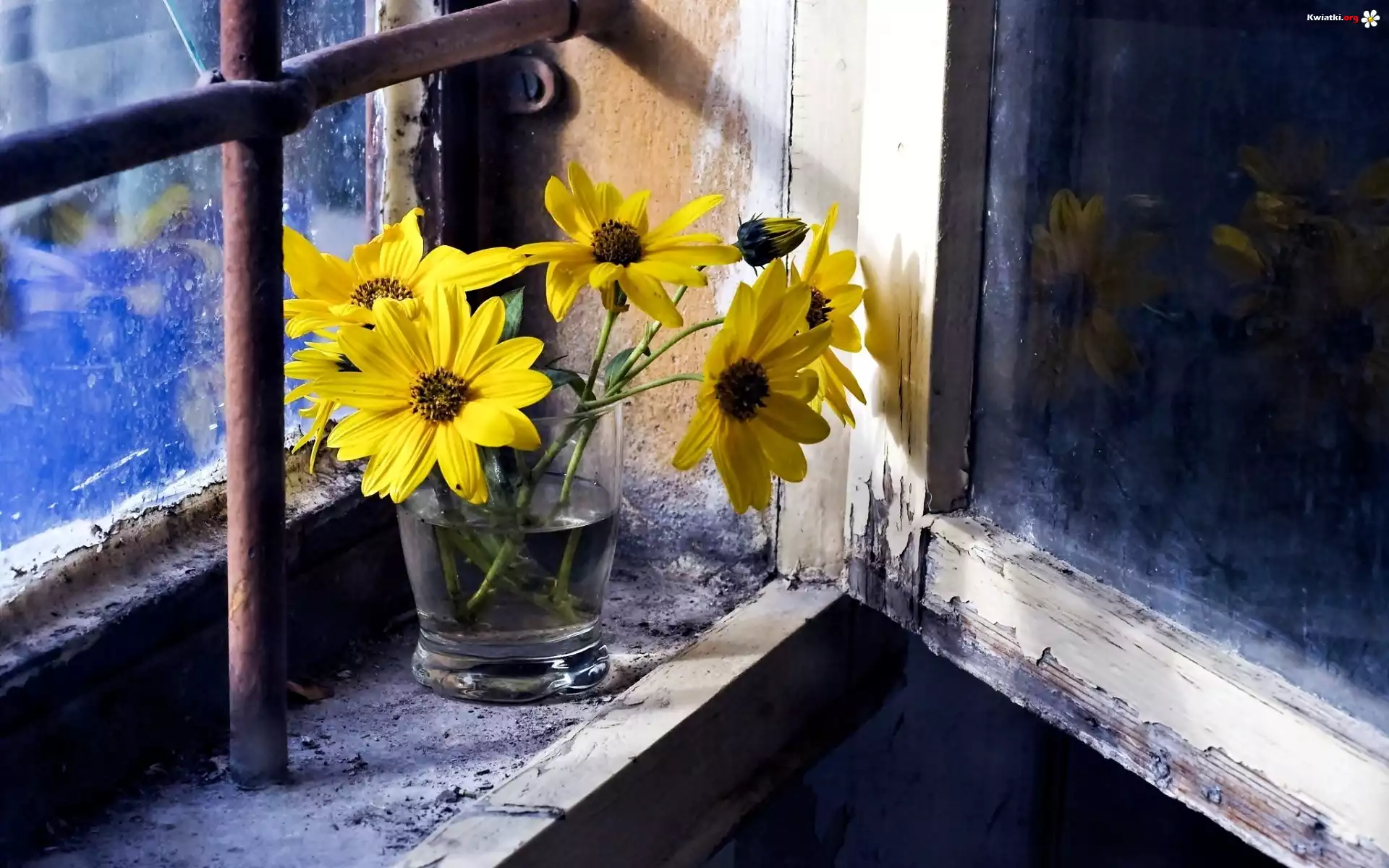 Bukiet, Żółte, Kwiaty, Szklanka, Okno, Parapet - Zdjęcia
