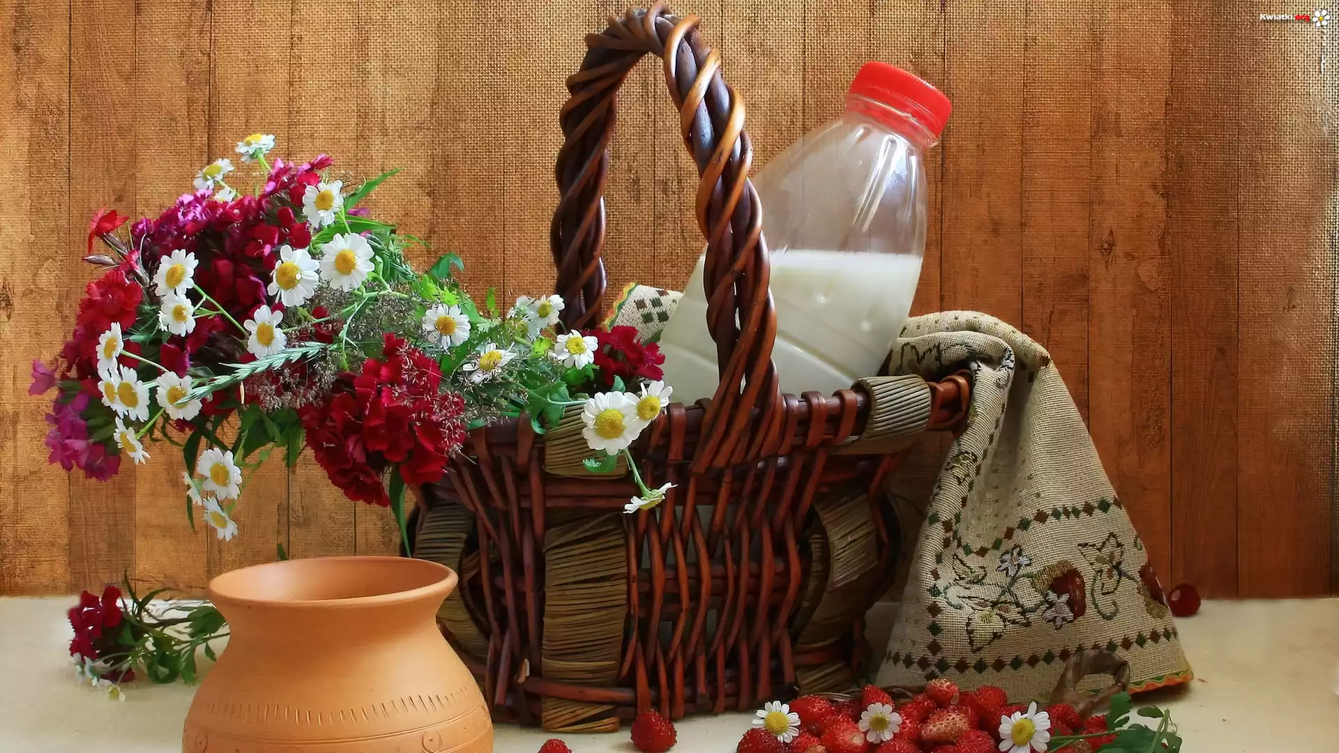 Bukiet, Kwiatów, Kosz, Poziomki, Mleko - Zdjęcia