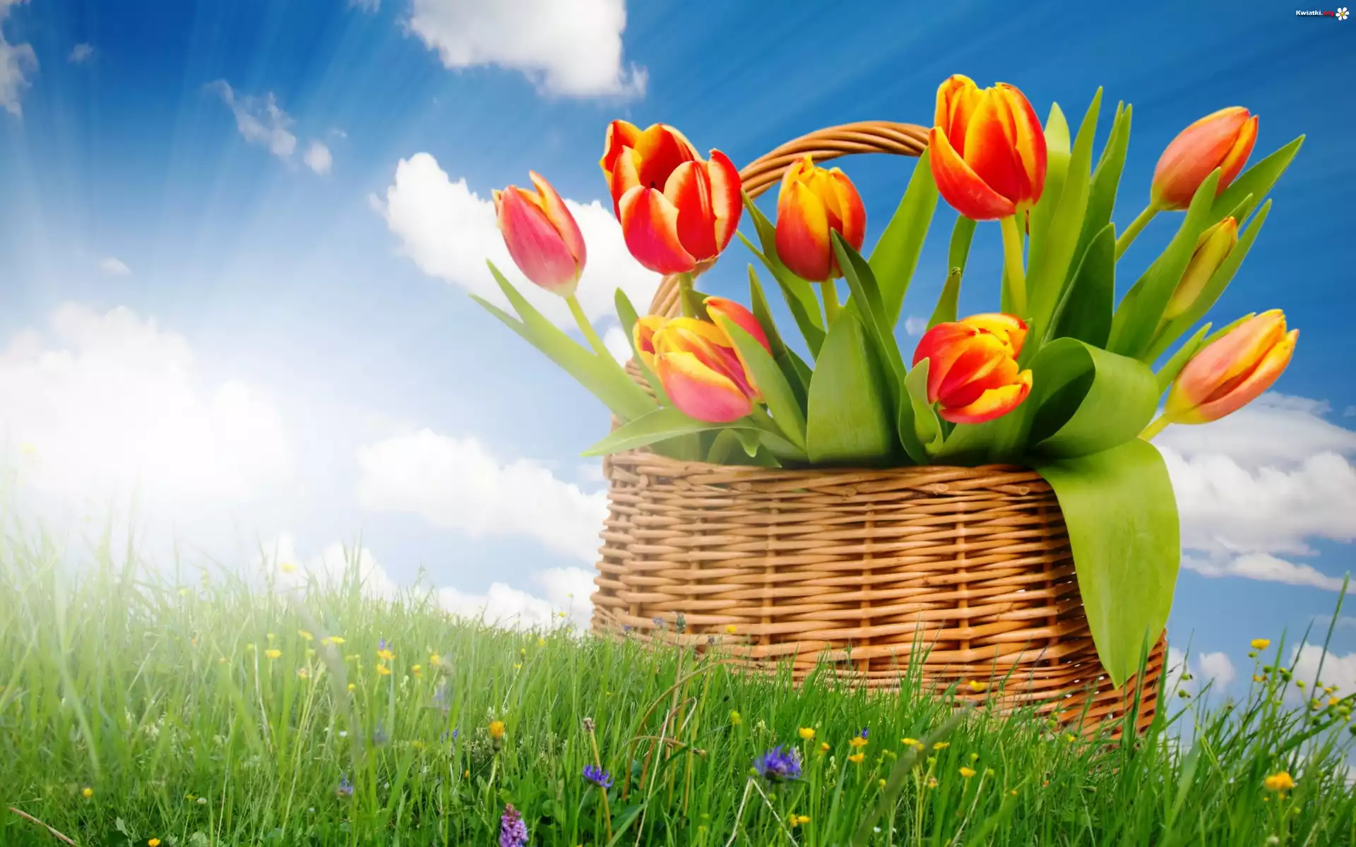 Bukiet, Tulipanów, Koszyk, Łąka, Promienie, Słońca - Zdjęcia