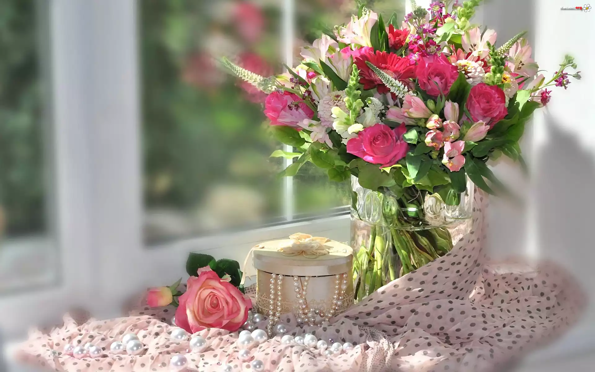 Kwiat Bukiet, Róże, Gerbera, Budleja, Pudełko, Perły