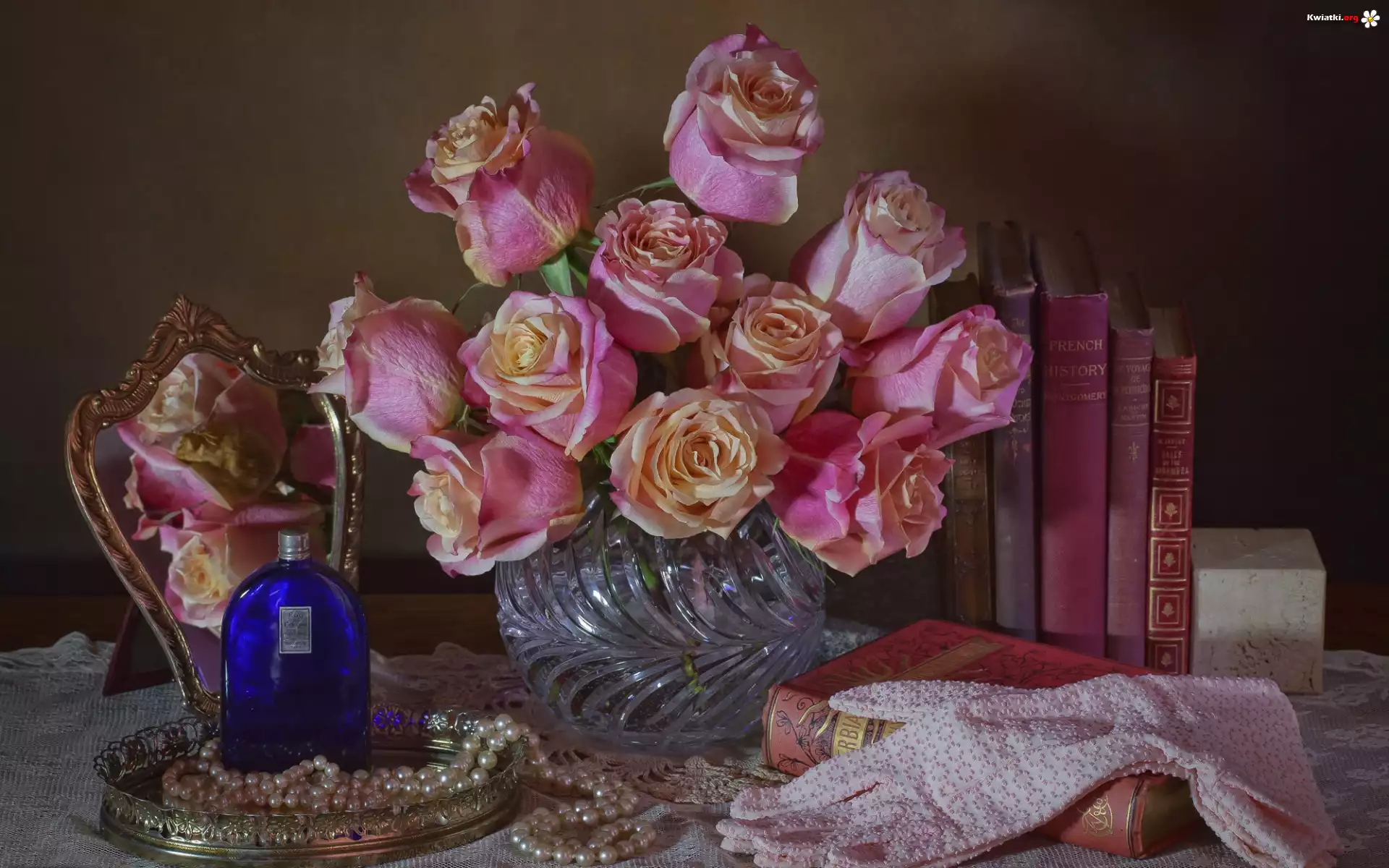 Kwiat Wazon, Bukiet, Róże, Książki, Perfum, Lustro, Perły, Rękawiczki