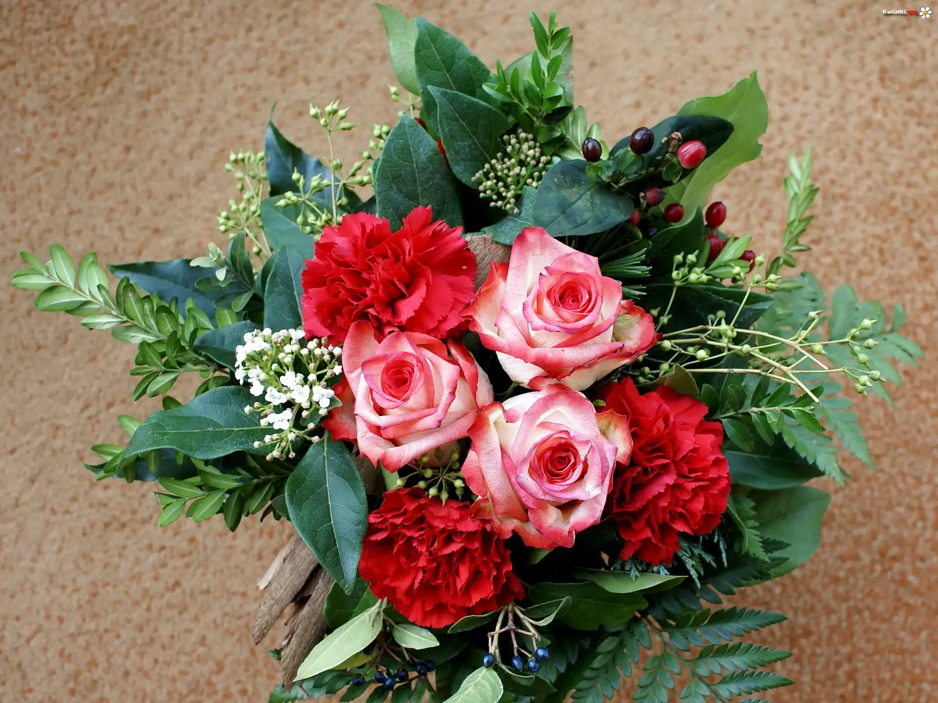 Bukiet, Kwiatów, Róże, Goździki - Zdjęcia