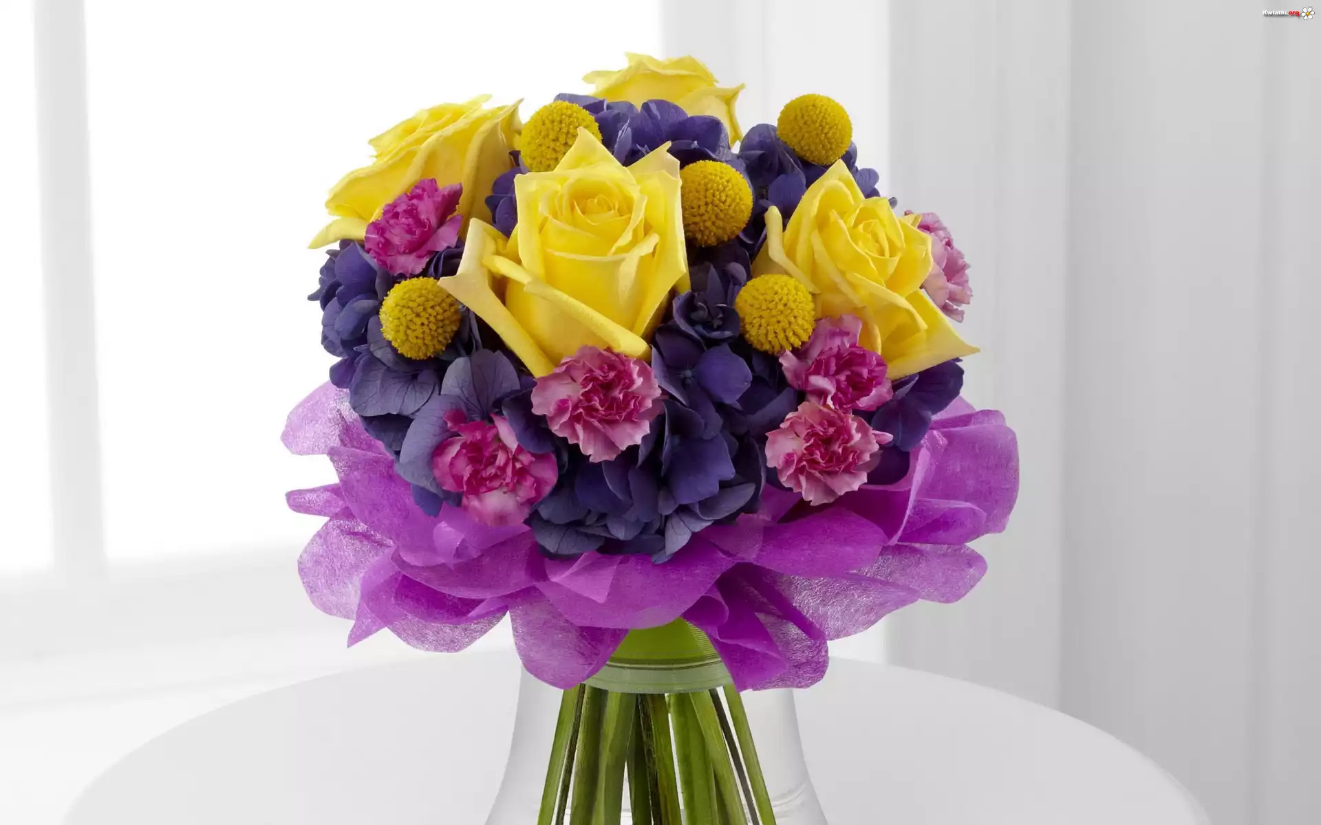 Bukiet, Kwiatów, Żółte, Róże, Goździki - Zdjęcia