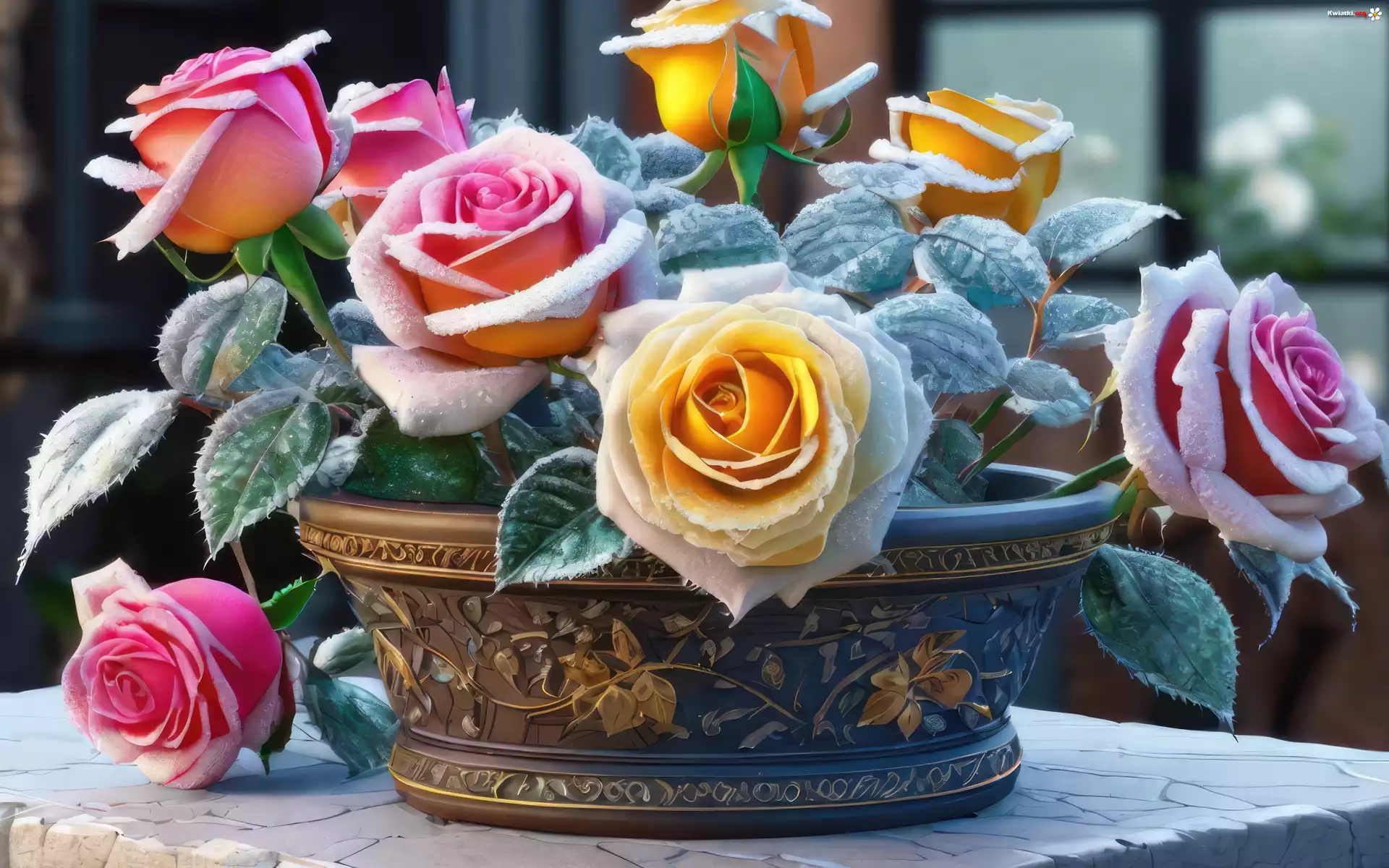 Kwiat Róże, Różowy, Żółty, Bukiet, Wazon, Stół