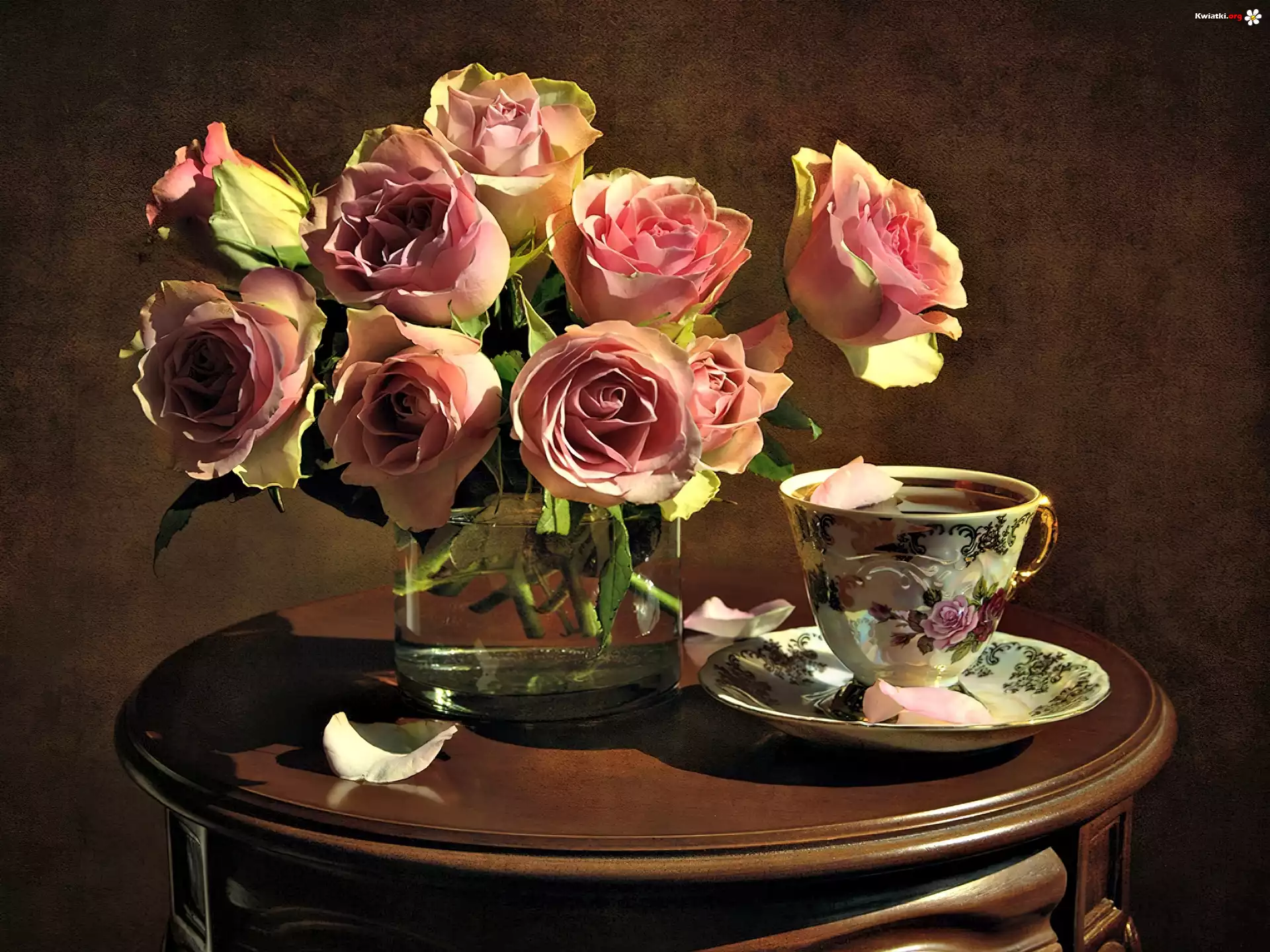 Bukiet, Róż, Stolik, Filiżanka - Zdjęcia