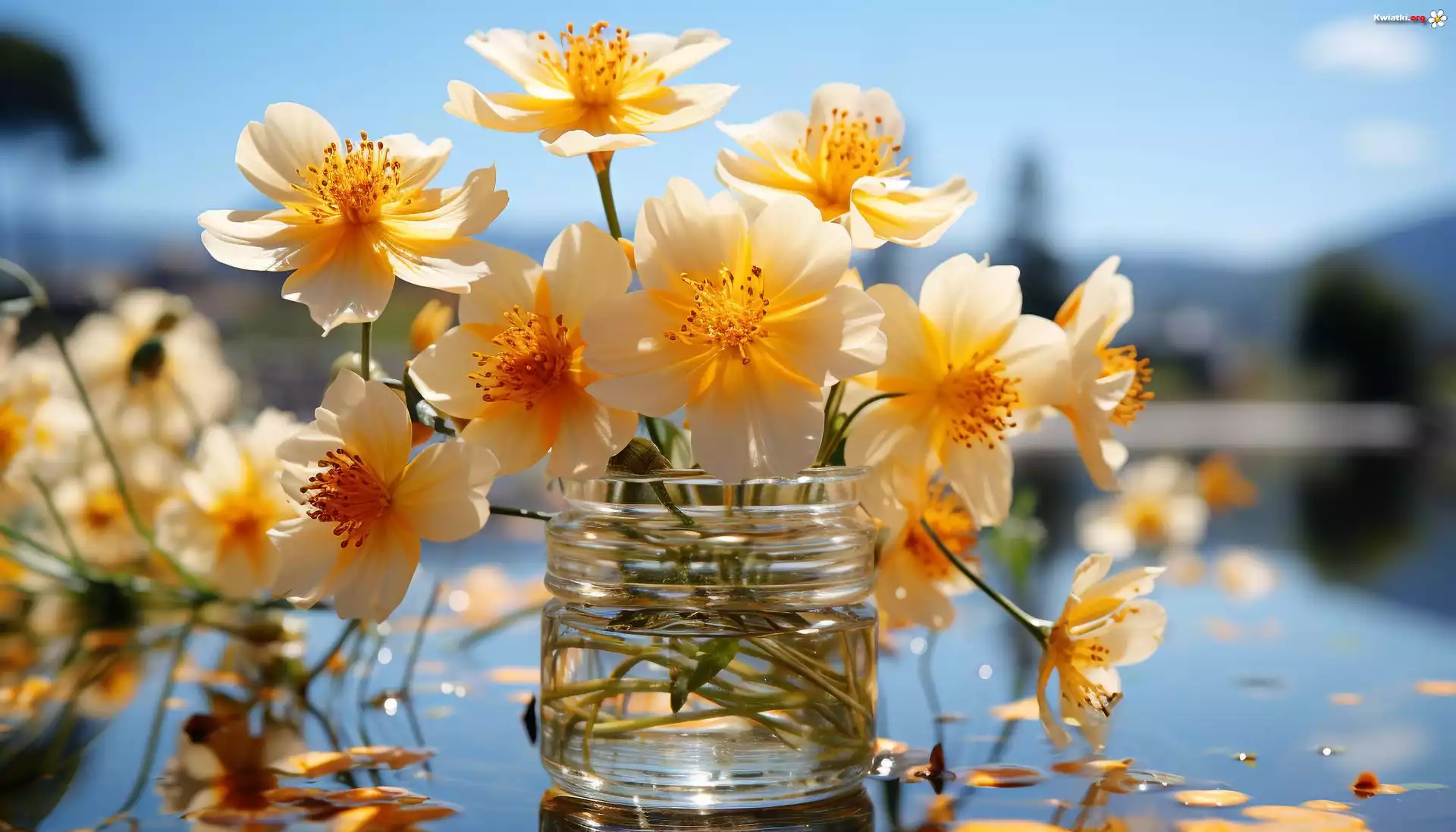 Niebieskie, Białe, Kwiaty, Wazon Forsycja