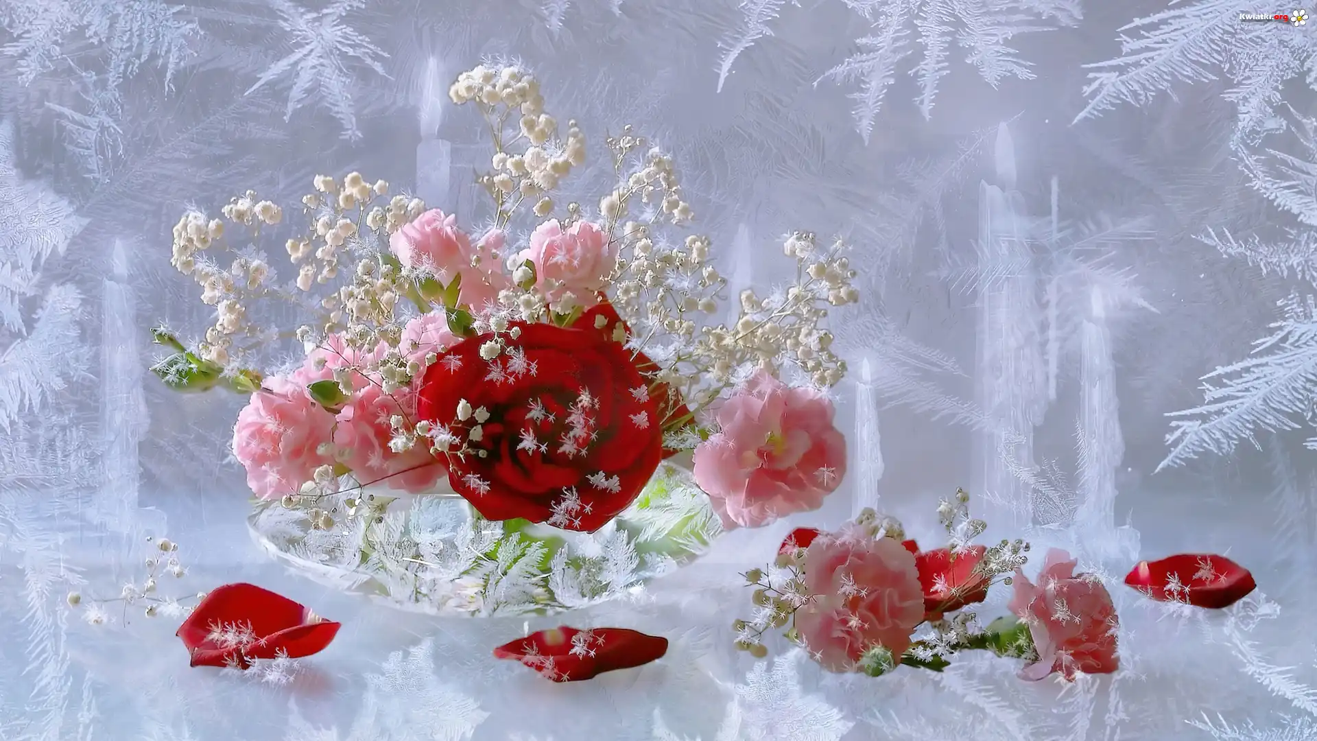 Bukiet, Kwiatów, Szyba, Mróz - Zdjęcia