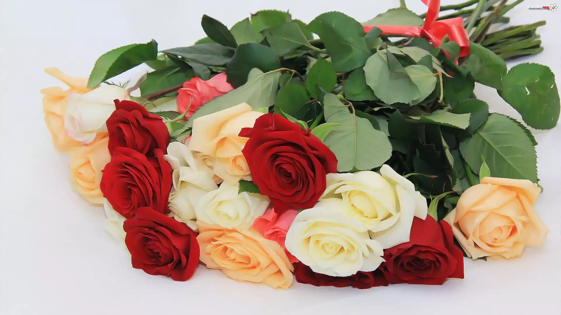 Bukiet, Róże, Tło, Wstążka - Zdjęcia