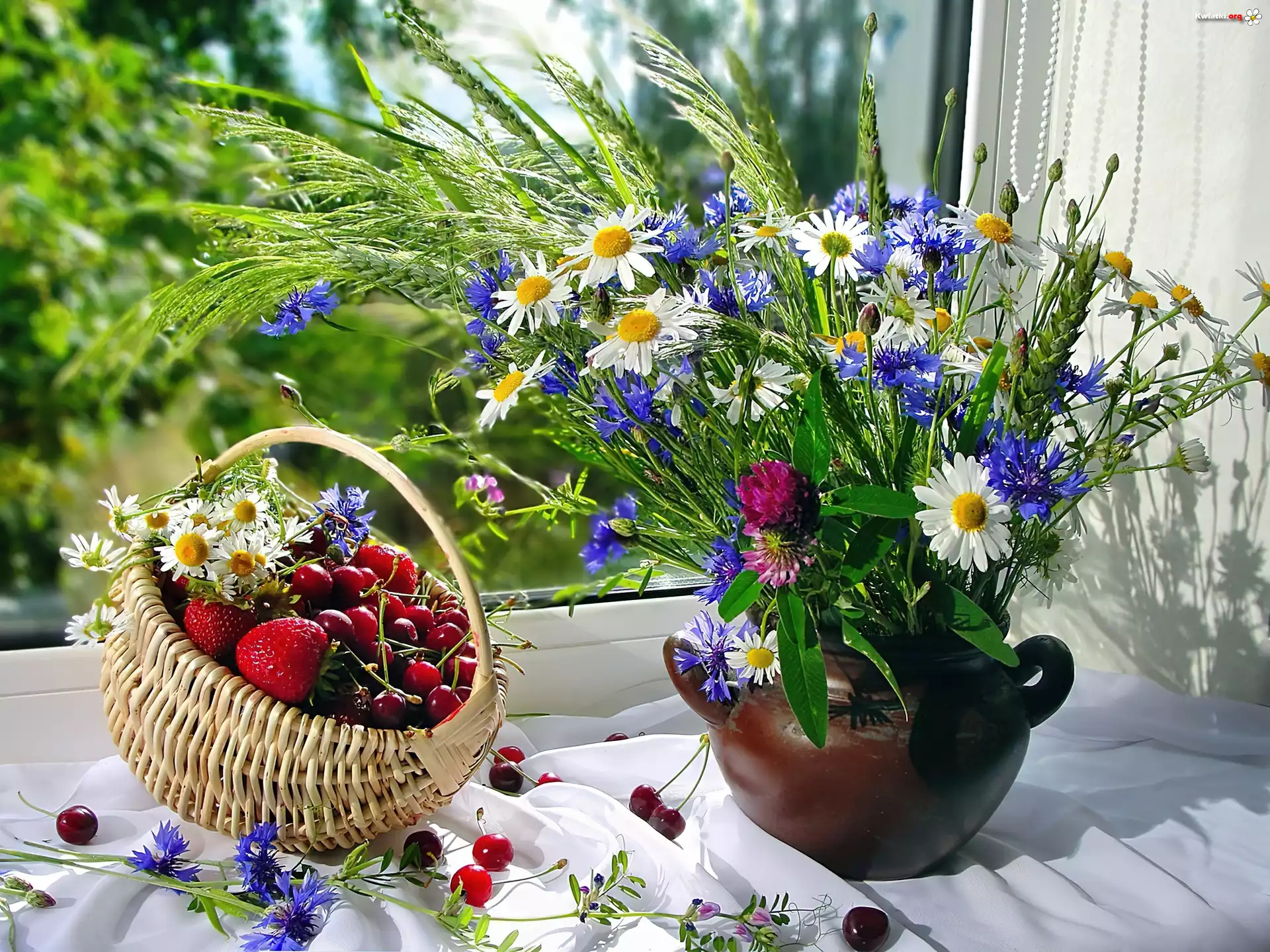 Bukiet, Polnych, Kwiatów, Czereśnie, Truskawki, Kompozycja - Zdjęcia