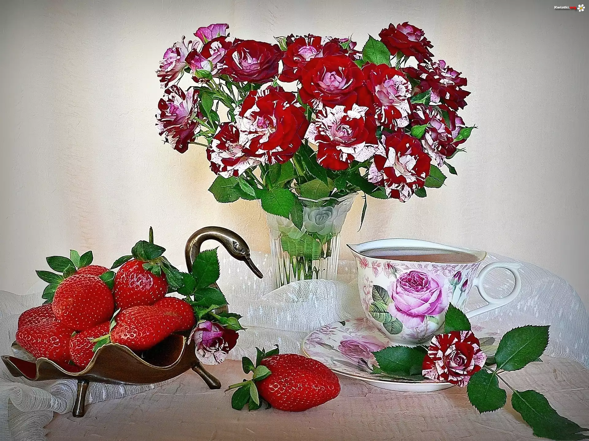 Kwiat Bukiet, Róż, Truskawki, Herbatka