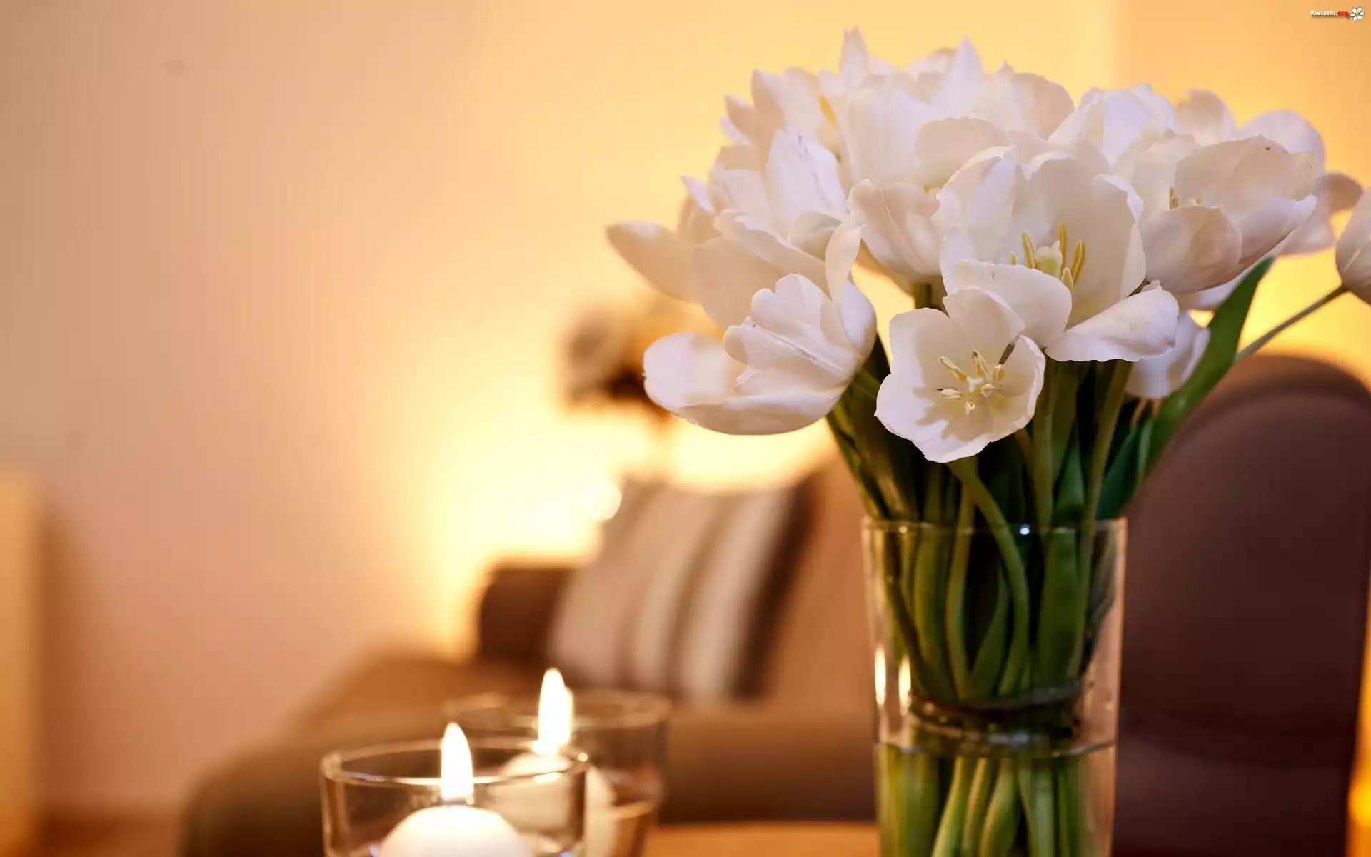 Kwiat Bukiet, Białe, Tulipany, Świeczki