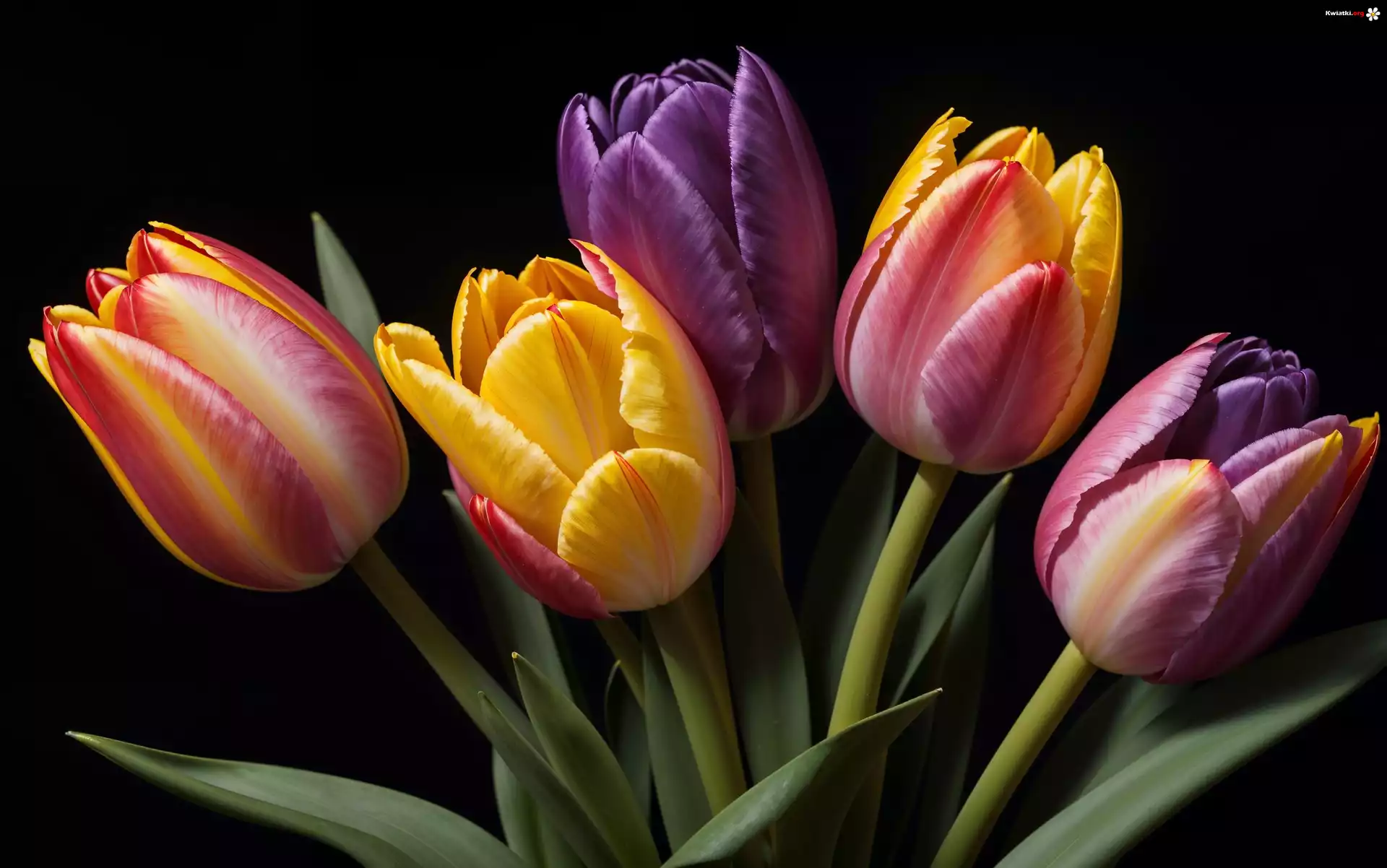 Tulipany, Kolorowe, Liście, Bukiet - Zdjęcia