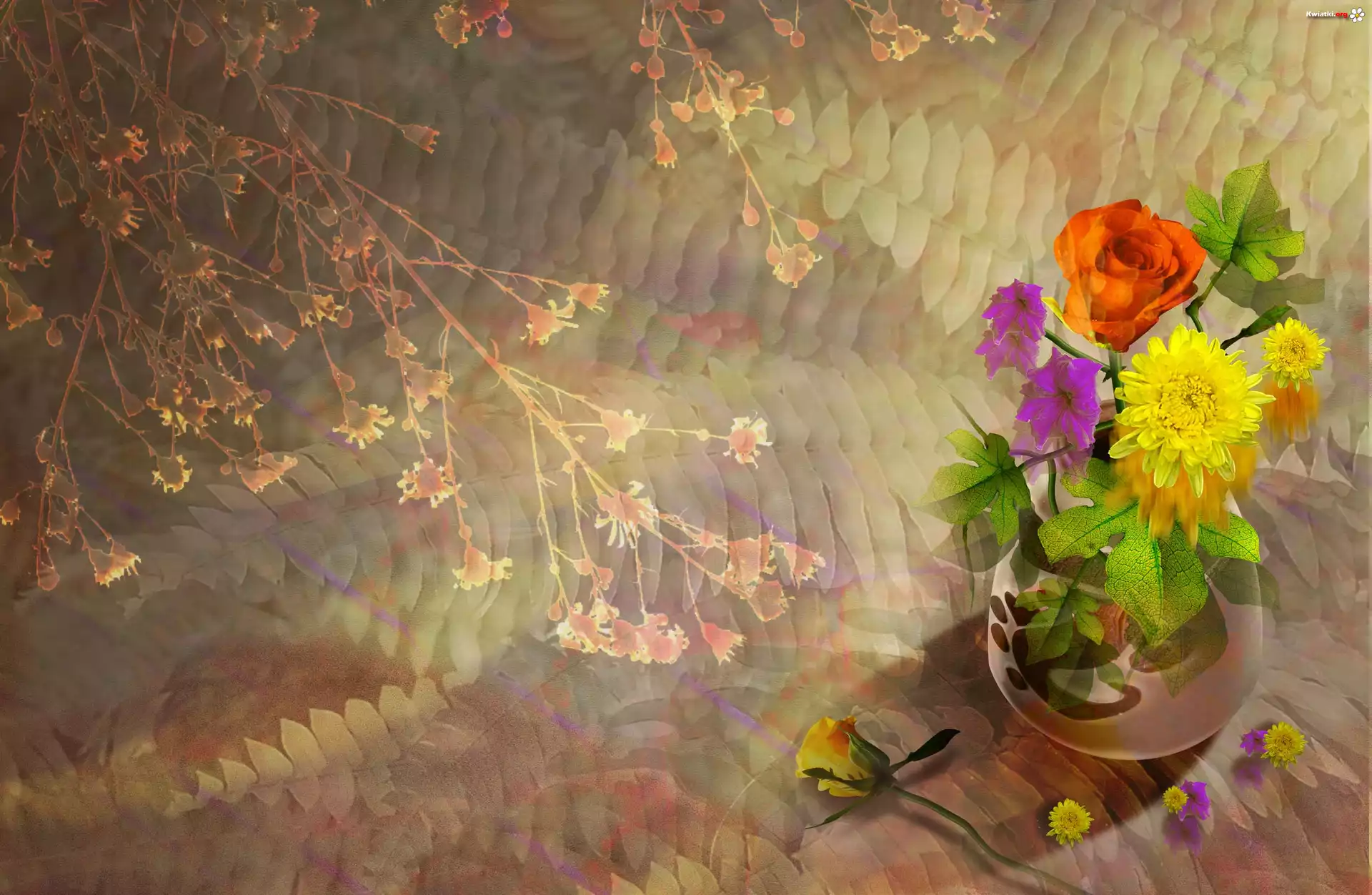 Bukiet, Kwiatów, Wazon, Gałązki - Zdjęcia