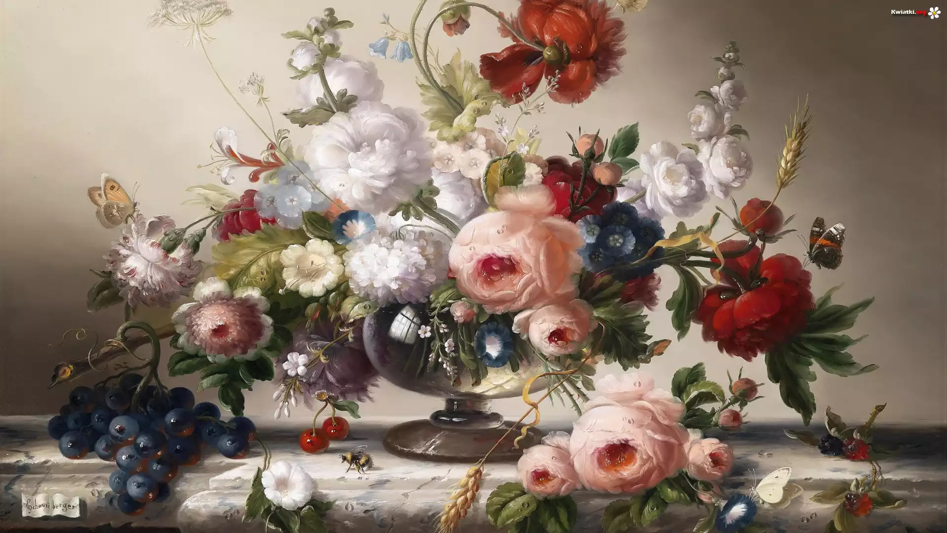 Kwiat Bukiet, Kwiatów, Wazon, Winogrona