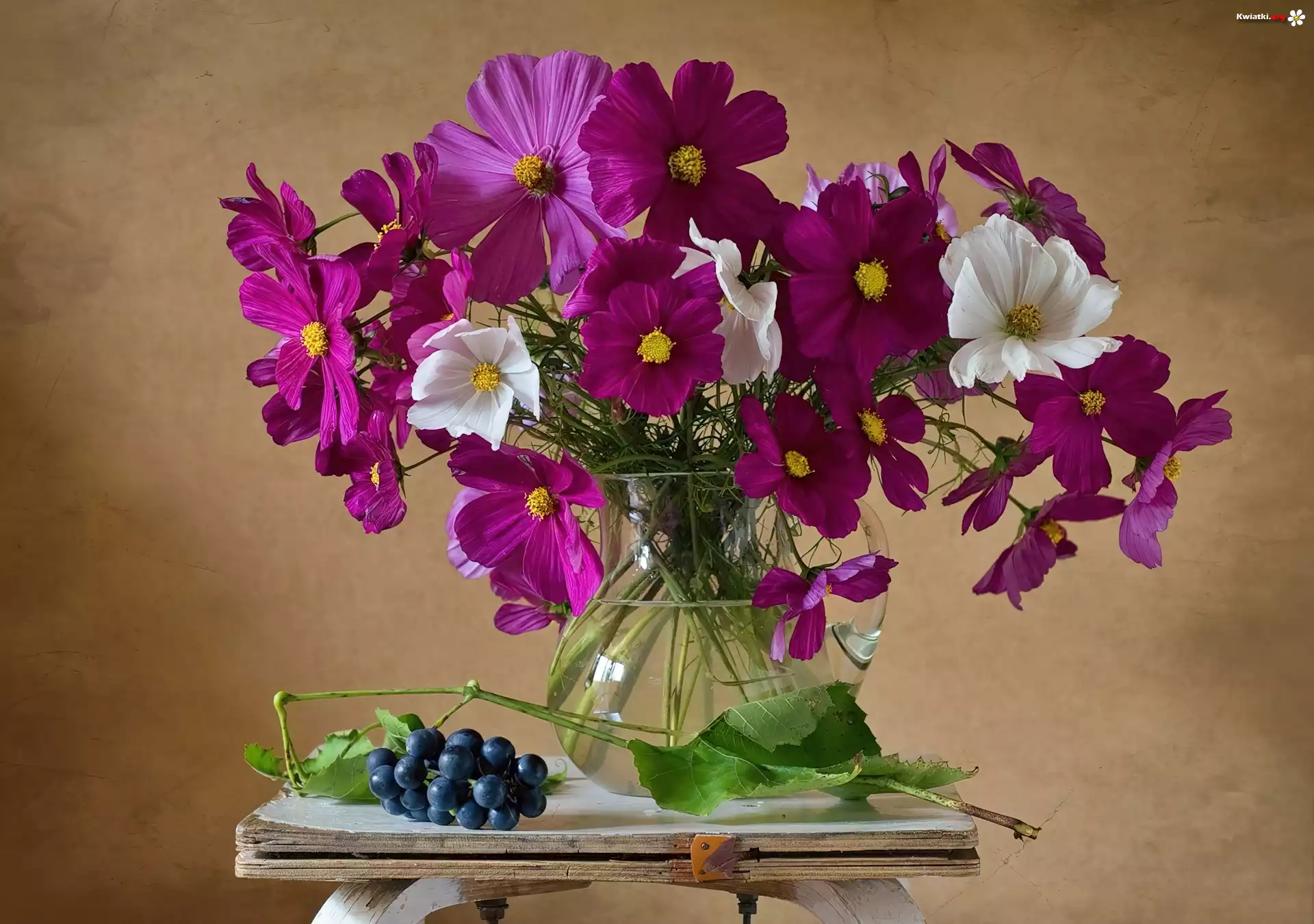 Kosmea, Białe, Fioletowe, Kwiaty, Winogrona, Taboret - Zdjęcia