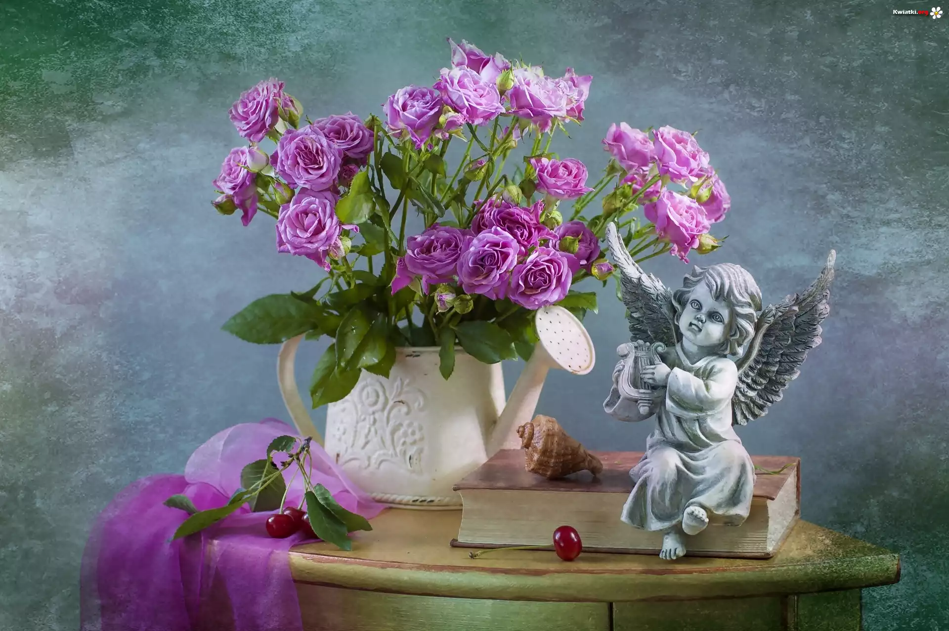 Kompozycja, Bukiet, Róże, Konewka, Figurka, Aniołka, Książka, Wiśnia - Zdjęcia