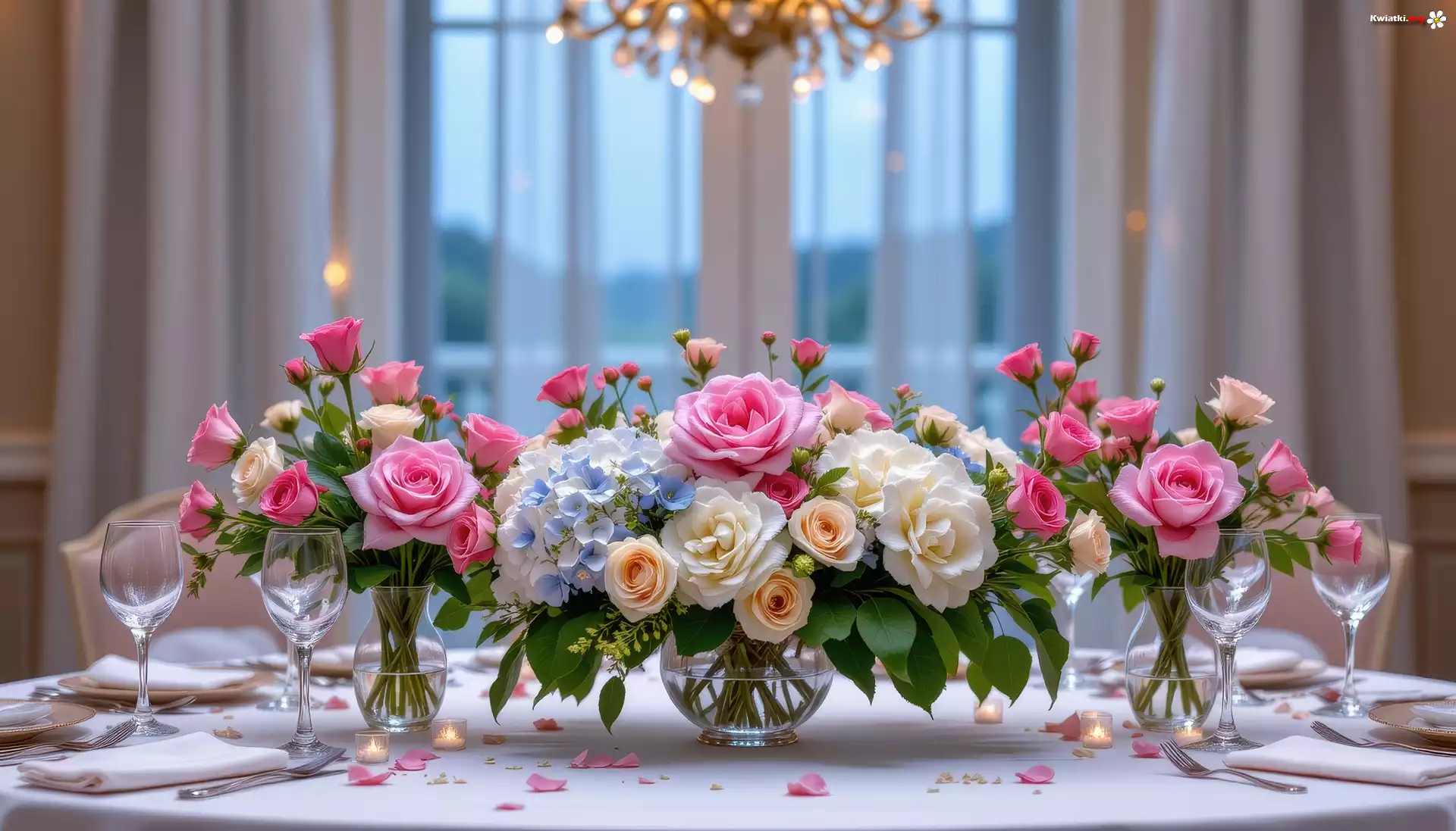 Stół, Róże, Kwiaty, Bukiety, Okno, Grafika AI - Zdjęcia