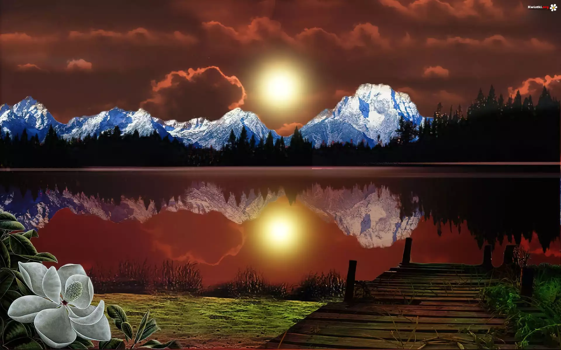 Kwiat Chmury, Słońce, Góry, Jezioro, Kwiat