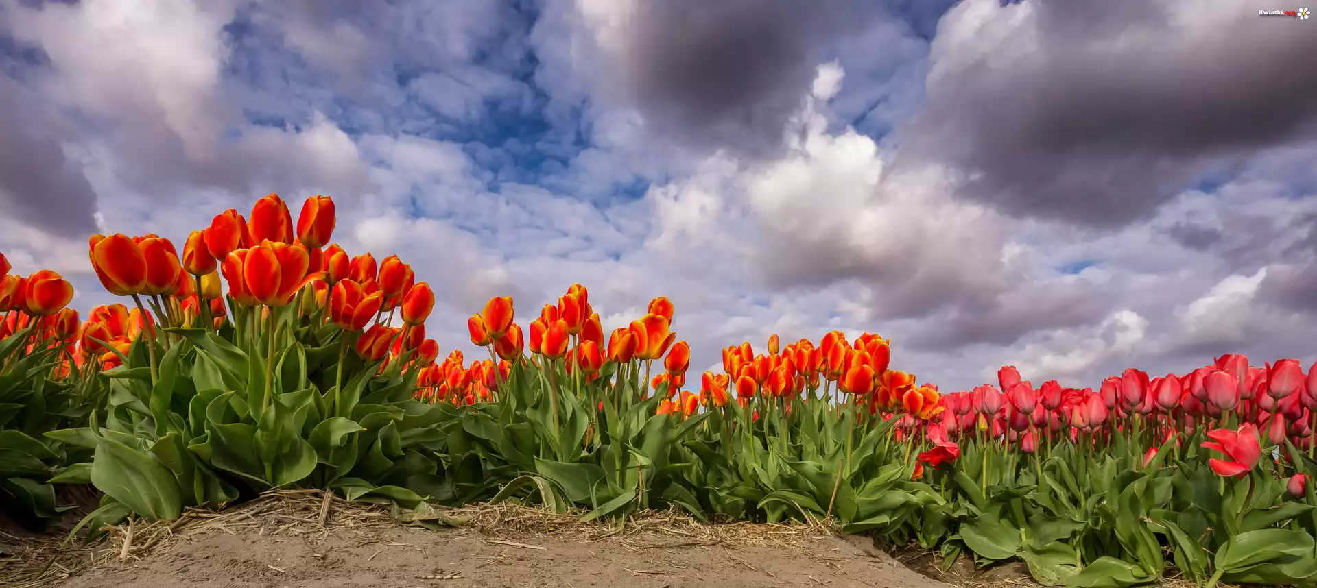 Kwiaty, Pomarańczowe, Czerwone, Tulipany, Niebo, Chmury - Zdjęcia