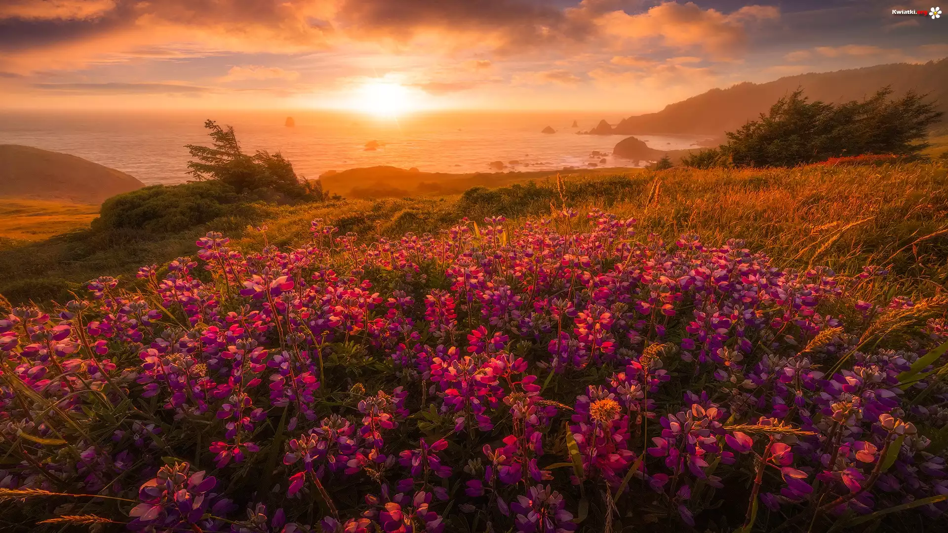 Morze, Wybrzeże, Łąka, Kwiaty, Łubin, Drzewa, Wschód słońca, Mgła, Chmury - Zdjęcia