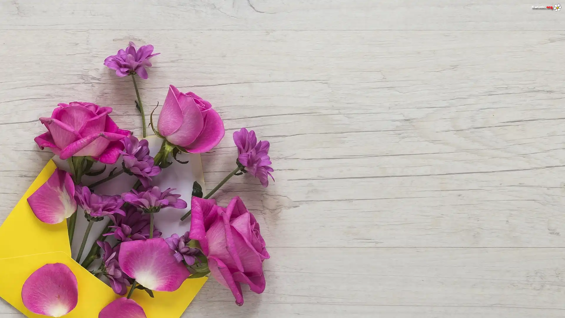 Żółta, Koperta, Róże, Chryzantemy, Deski - Zdjęcia