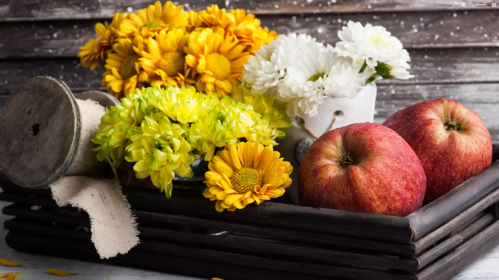 Chryzantemy, Jabłka, Szpulka, Materiał, Skrzynka - Zdjęcia