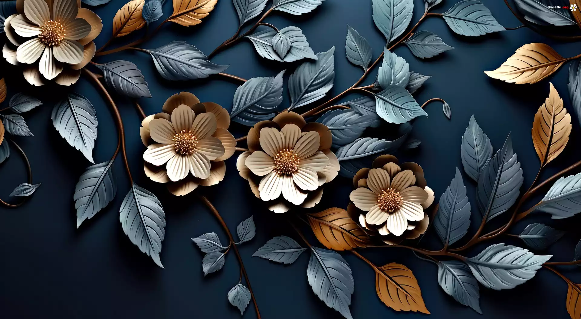 Złote, Kwiaty, Liście, Ciemne, Tło, Grafika - Zdjęcia