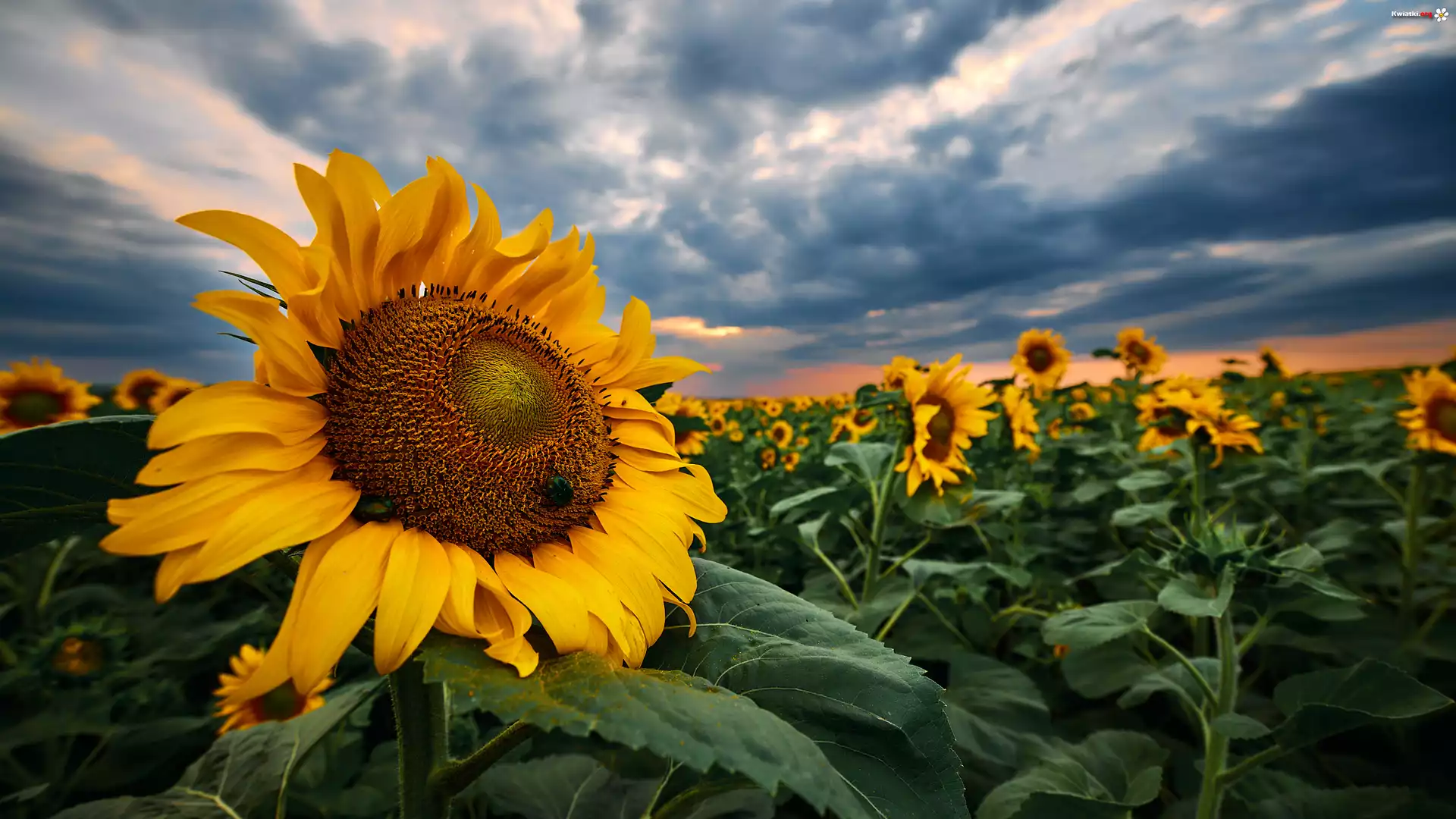 Pole, Kwitnące, Słoneczniki, Ciemne, Chmury, Niebo - Zdjęcia