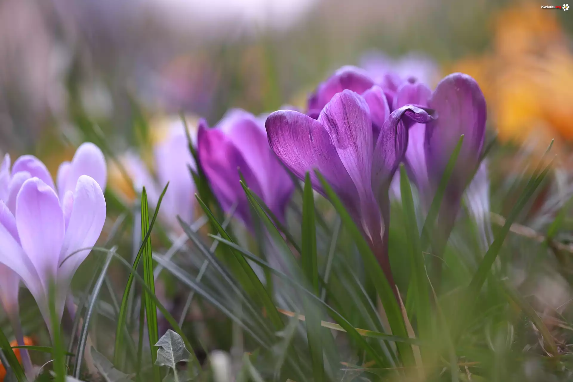 Kwiat Jasnofioletowe, Ciemnofioletowe, Krokusy, Kwiaty, Trawa