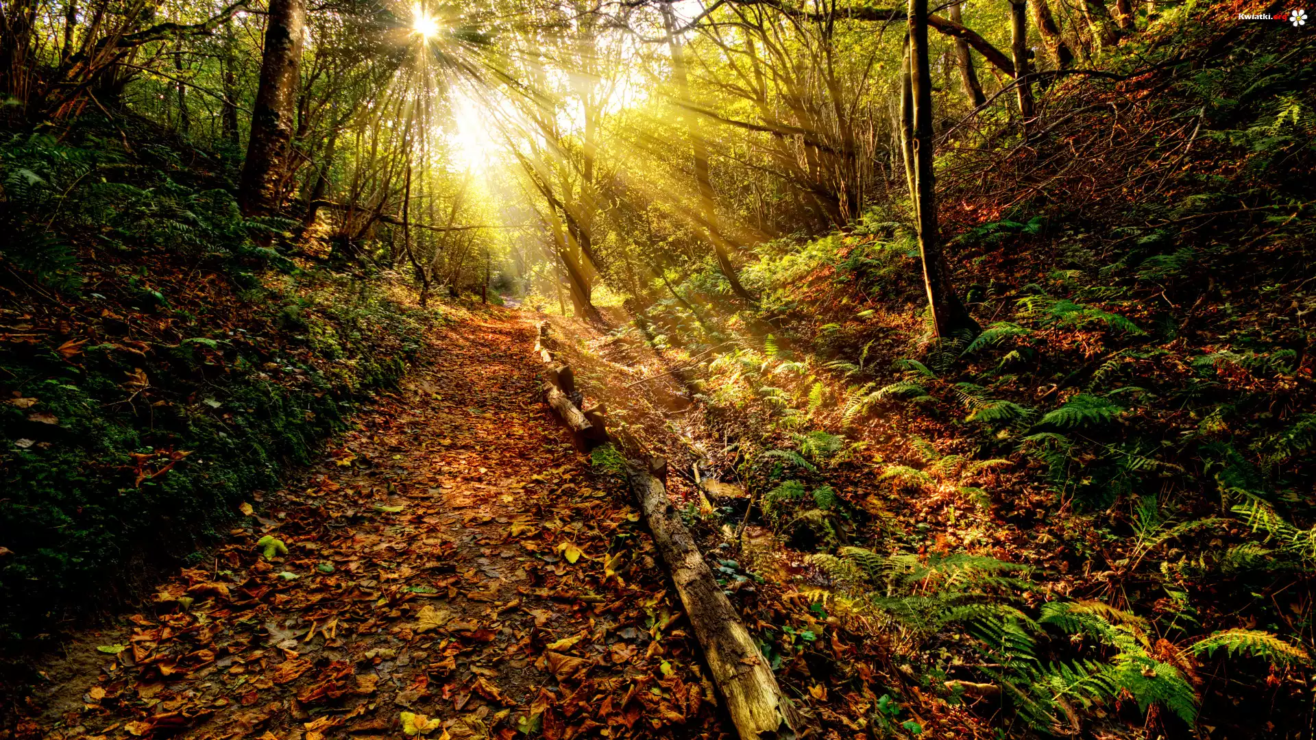 Kwiat Las, Ścieżka, Liście, Paprocie, Promienie, Słońca, Jesień