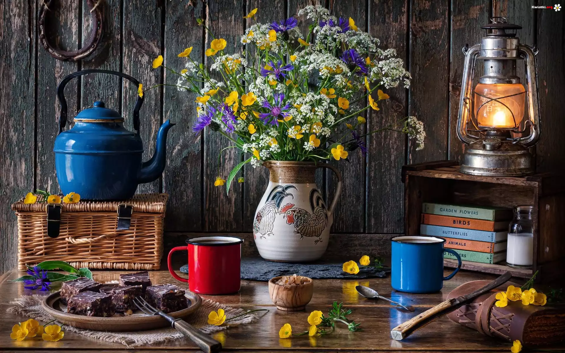 Kwiat Kompozycja, Bukiet kwiatów, Czajnik, Lampa, Ciasto, Kubki