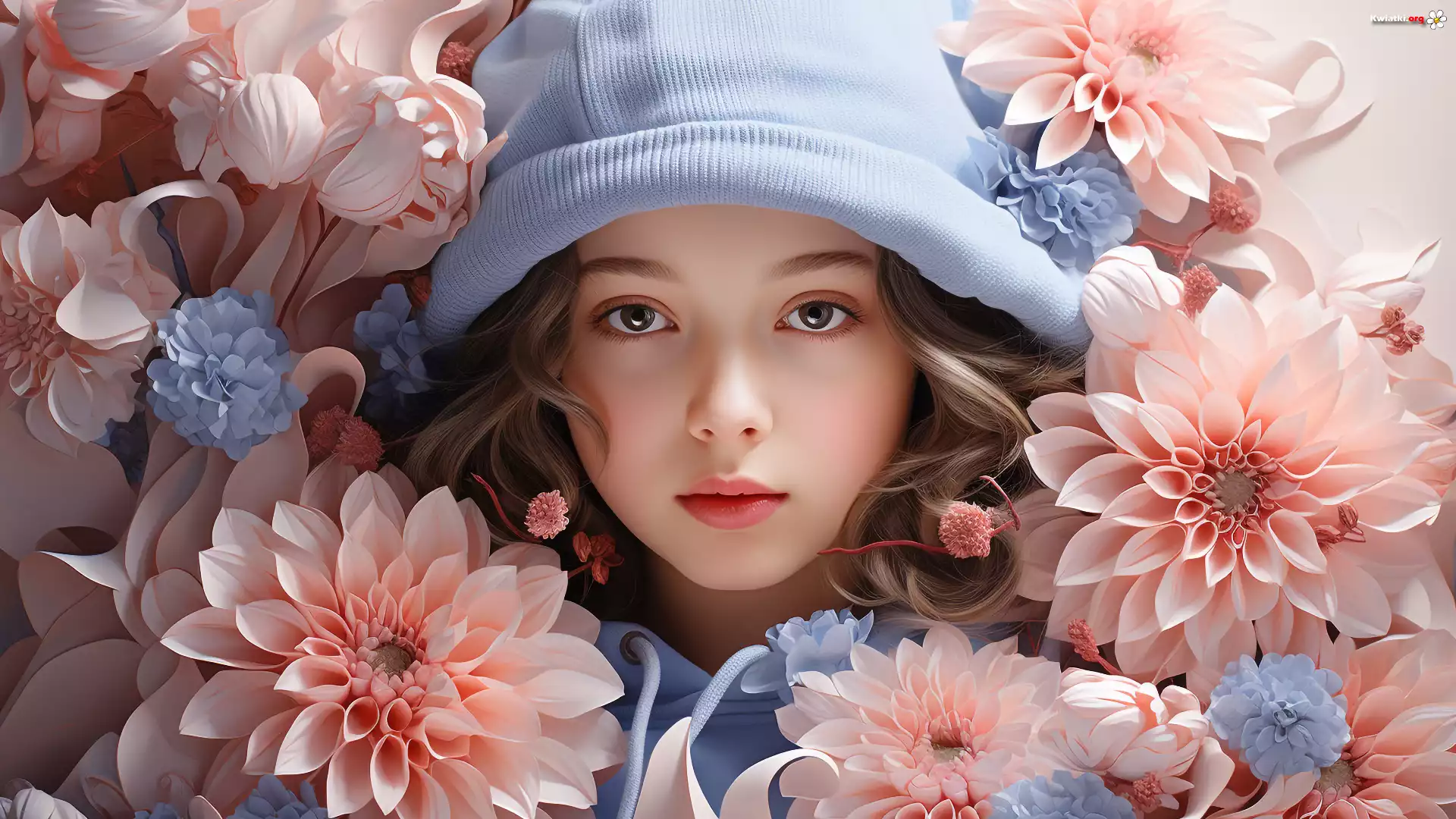 Kwiat Dziewczynka, Blondynka, Nieieska, Czapka, Kolorowe, Kwiaty, Grafika