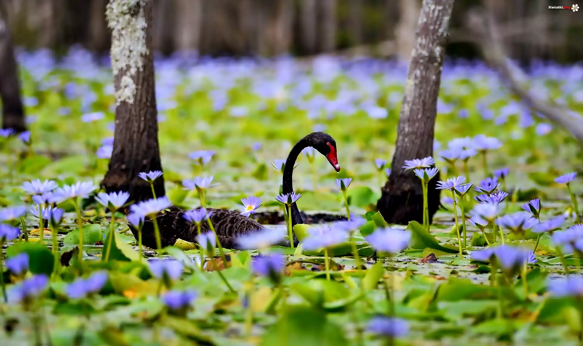 Czarny, Łabędź, Staw, Kwiaty, Lilie, Drzewa - Zdjęcia