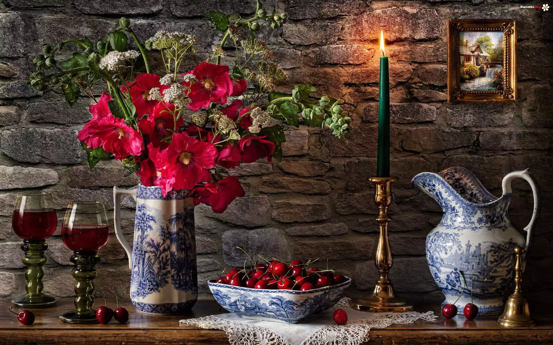 Kompozycja, Bukiet, Kwiaty, Malwy, Świeca, Dzbanek, Kieliszki, Czereśnie - Zdjęcia