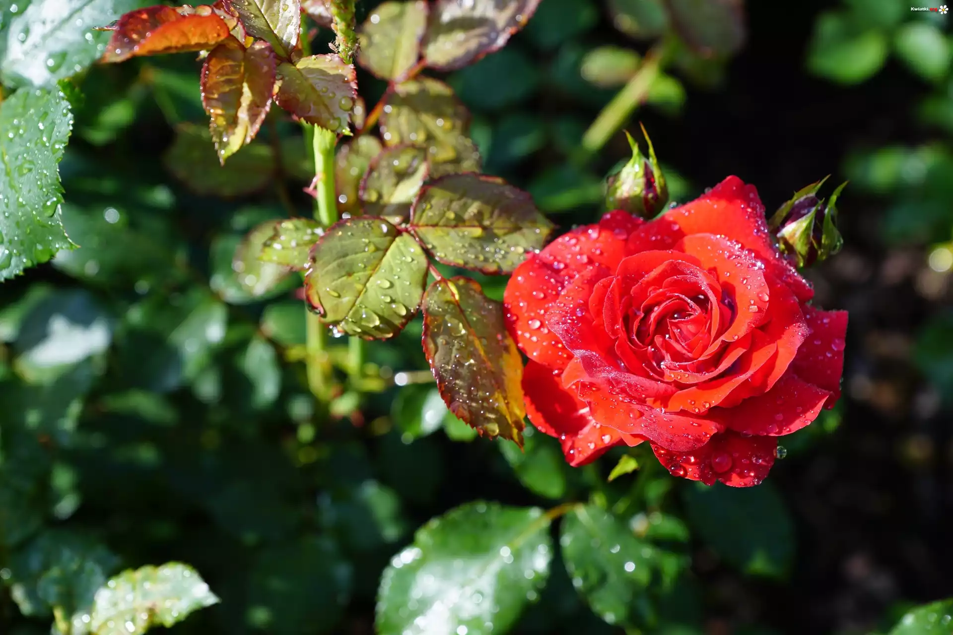 Kwiat Czerwona, Rozwinięta, Róża, Pączki, Krople, Wody
