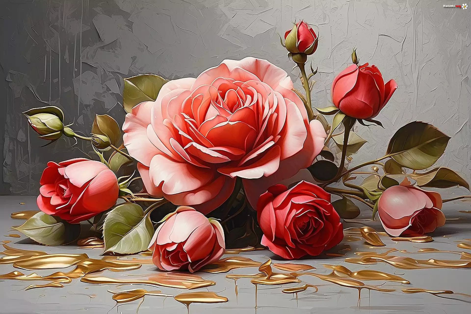 Róża, Czerwona, Pąki, Szare tło - Zdjęcia