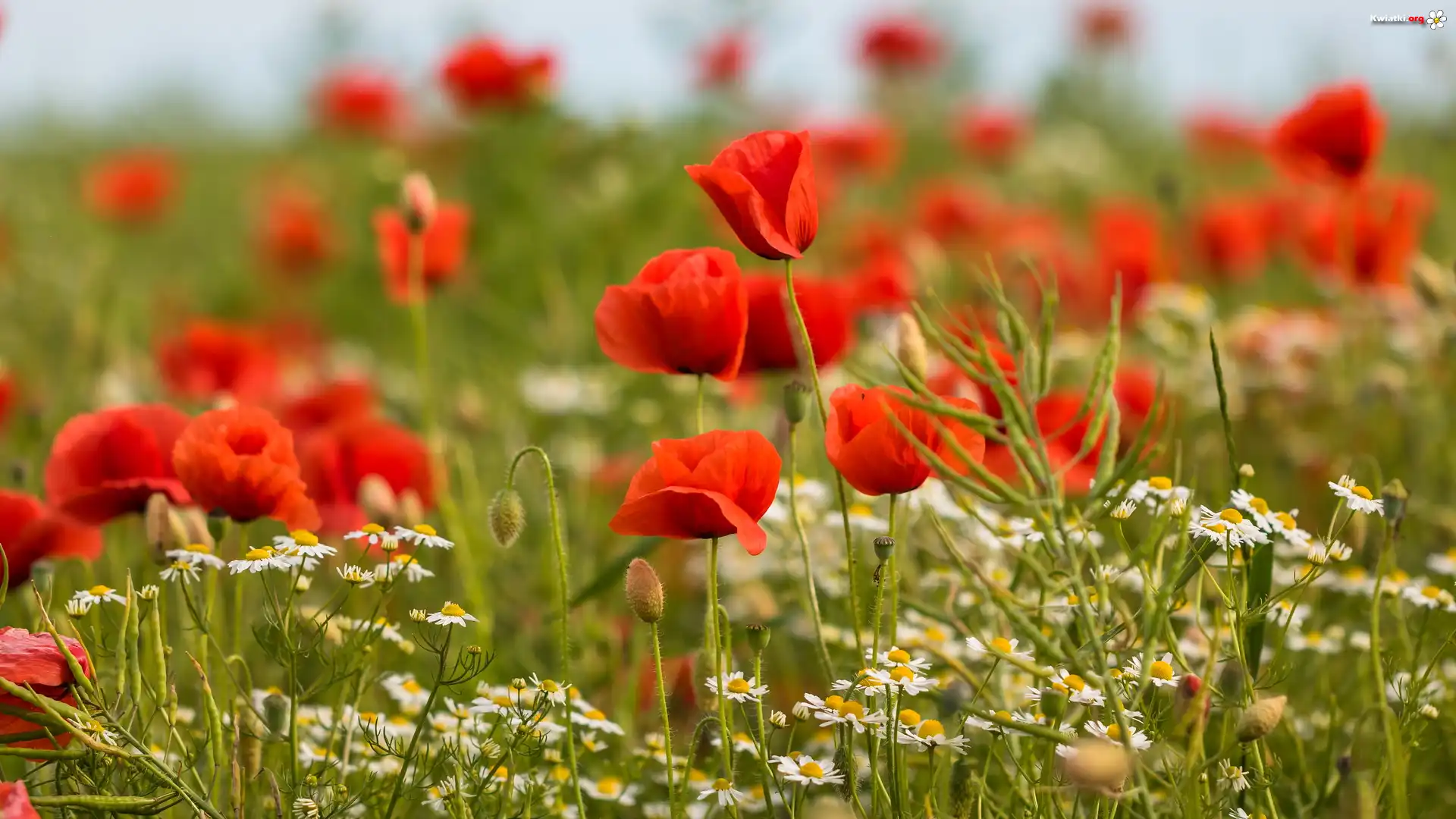 Kwiaty, Czerwone, Maki, Rumianki - Zdjęcia