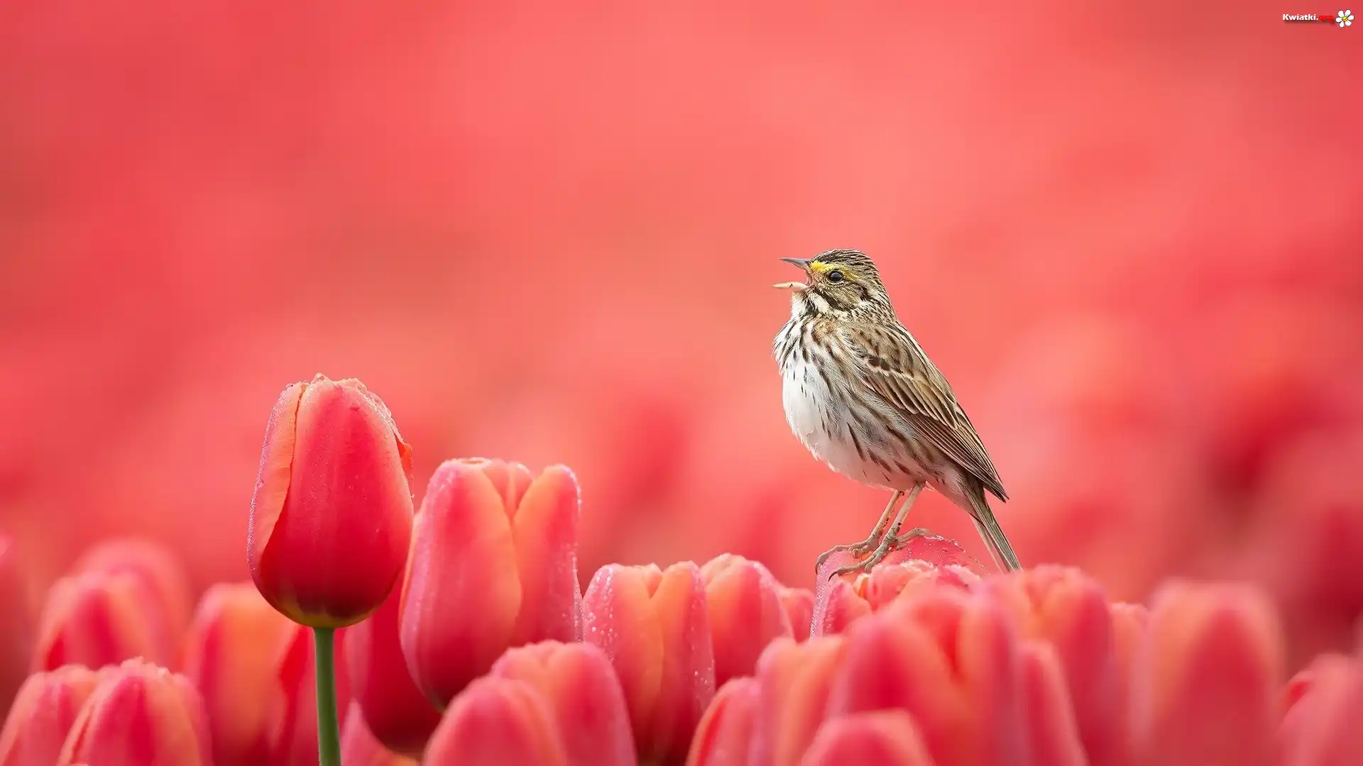 Czerwone, Tulipany, Ptak, Bagiennik żółtobrewy - Zdjęcia