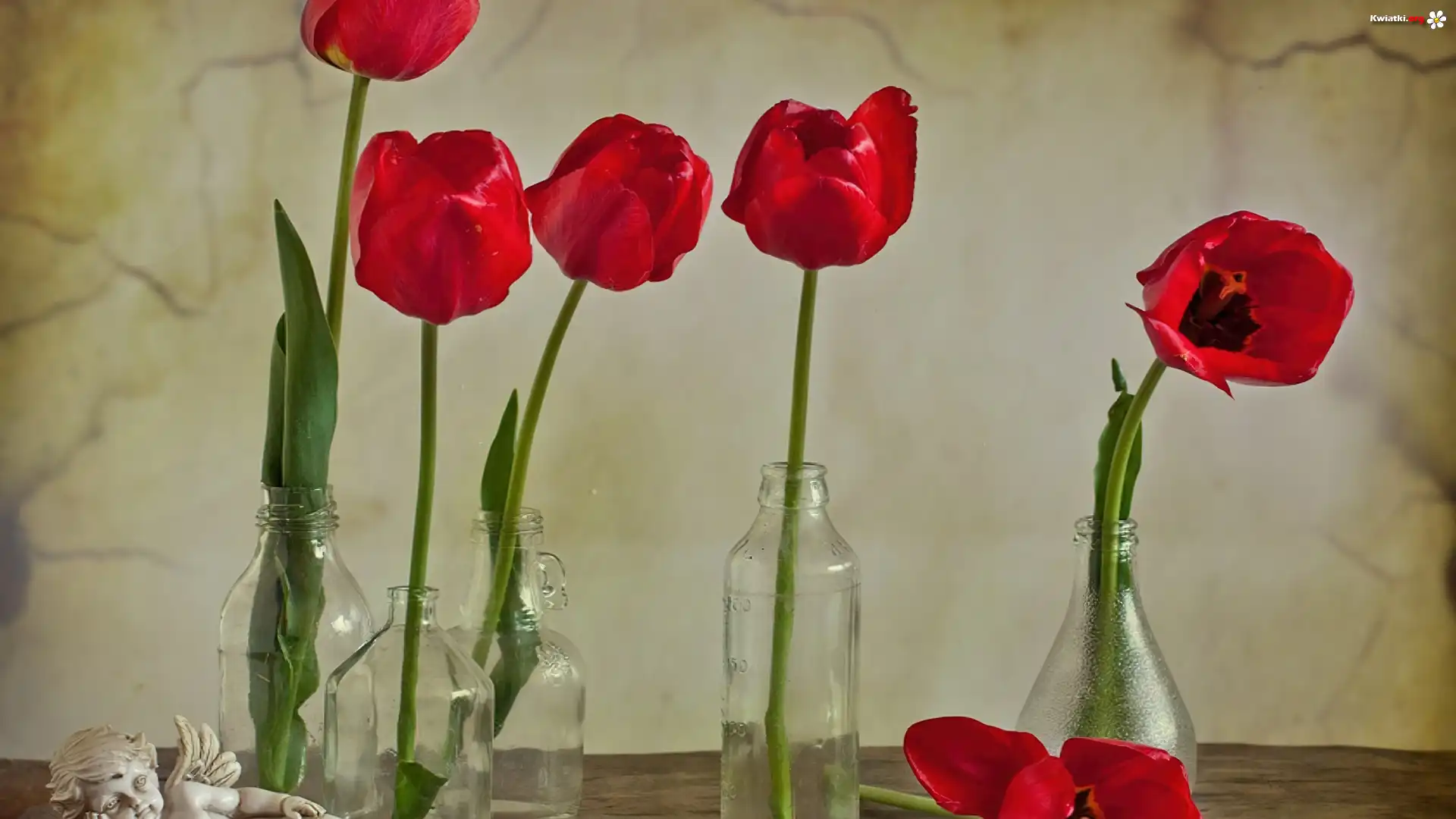 Czerwone, Tulipany, Butelki, Aniołek - Zdjęcia