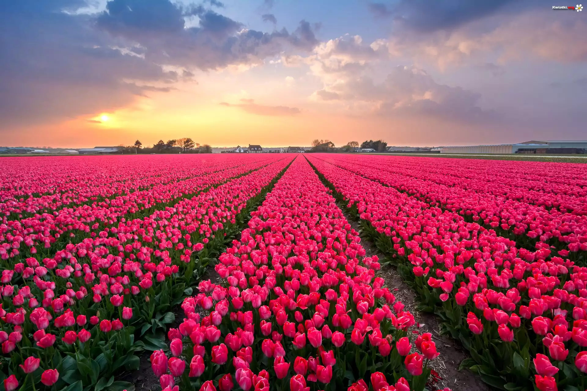 Pole, Plantacja, Kwiaty, Czerwone, Tulipany, Chmury - Zdjęcia