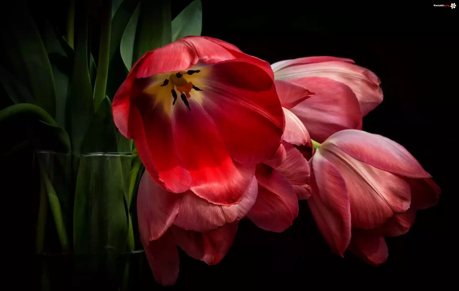 Kwiat Czerwone, Tulipany, Kwiaty, Wazon, Czarne tło