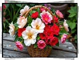 Kwiaty, Białe, Różowe, Czerwone, Koszyk, Deski - Zdjęcia