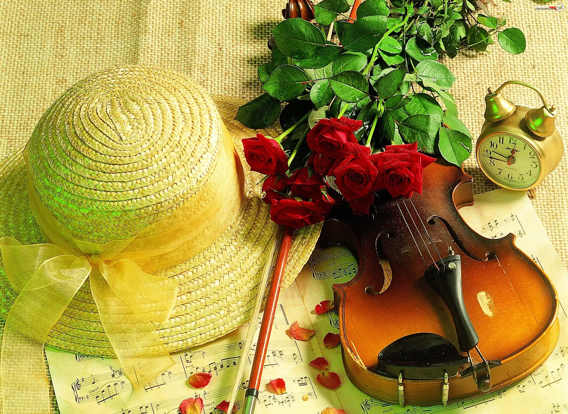 Kwiat Czerwone, Róże, Skrzypce, Kapelusz, Budzik