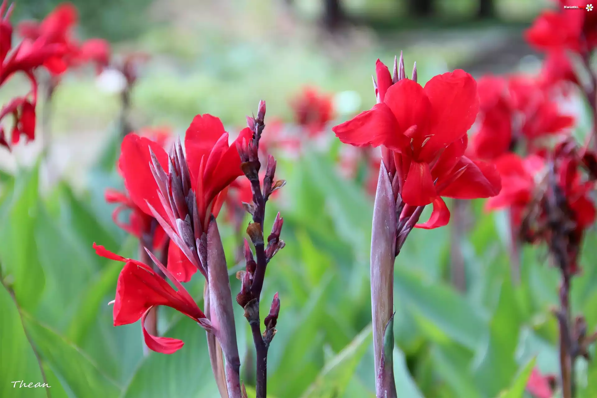 Kwiat, Paciorecznika, Złocistego Czerwone, Kwiaty Kwiaty, Kolory Paciorecznik, Czerwony, Japońska, Rozplenica, Liście, Trawy Kanna, Żółta, Nakrapiana Paciorecznik Kanna, Łodyga, Liście Paciorecznik Paciorecznik, Czerwony, Kwiatki, Niebieskie, Liście, Ogród, Lato
