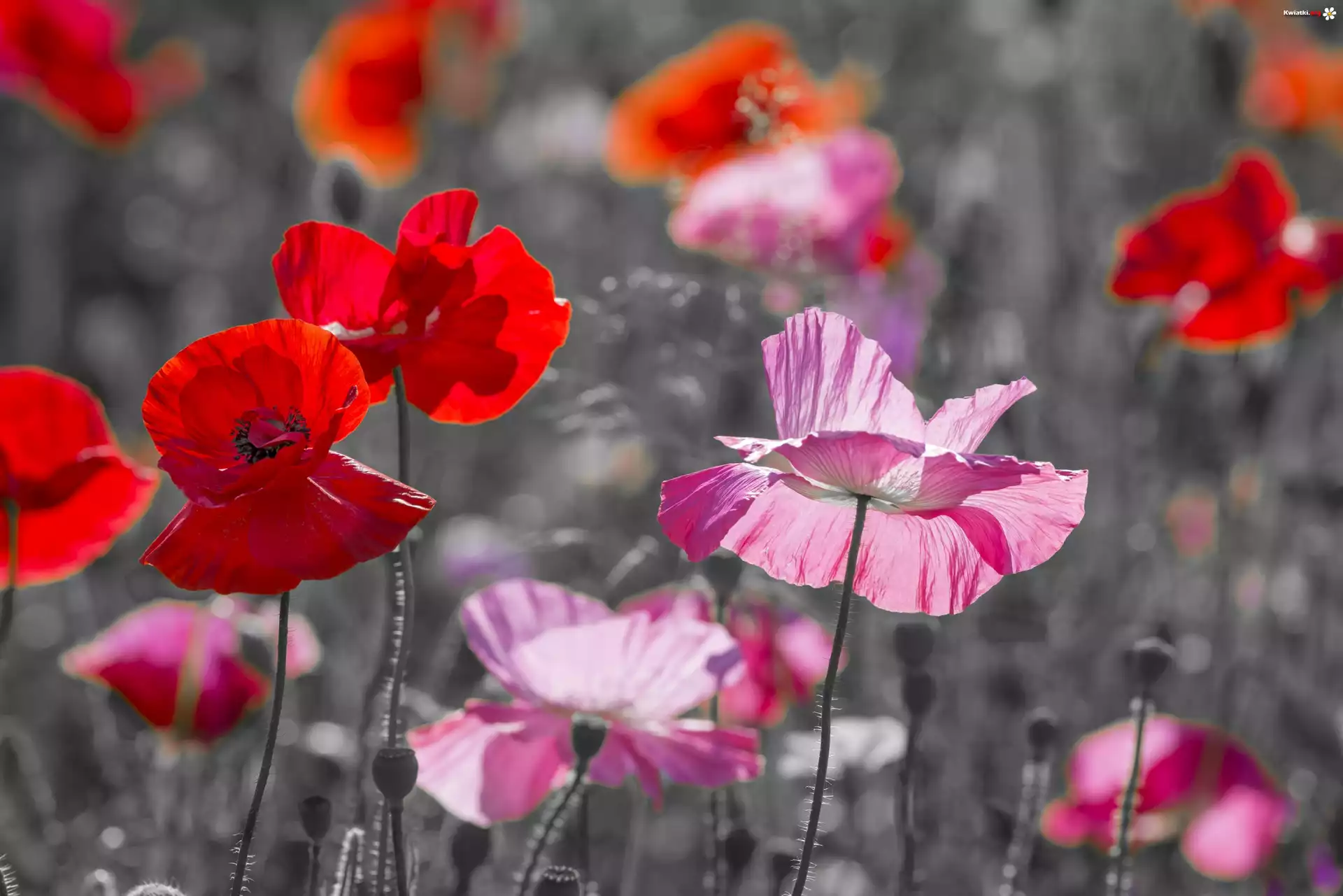 Czerwone, Różowe, Maki, Rozmycie - Zdjęcia