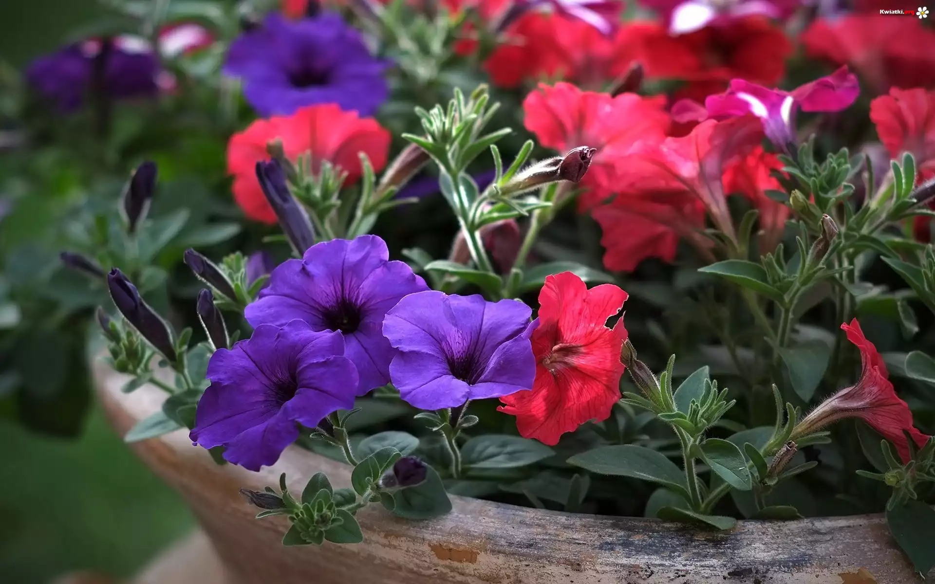 Kwiat Czerwone, Fioletowe, Petunie, Donica