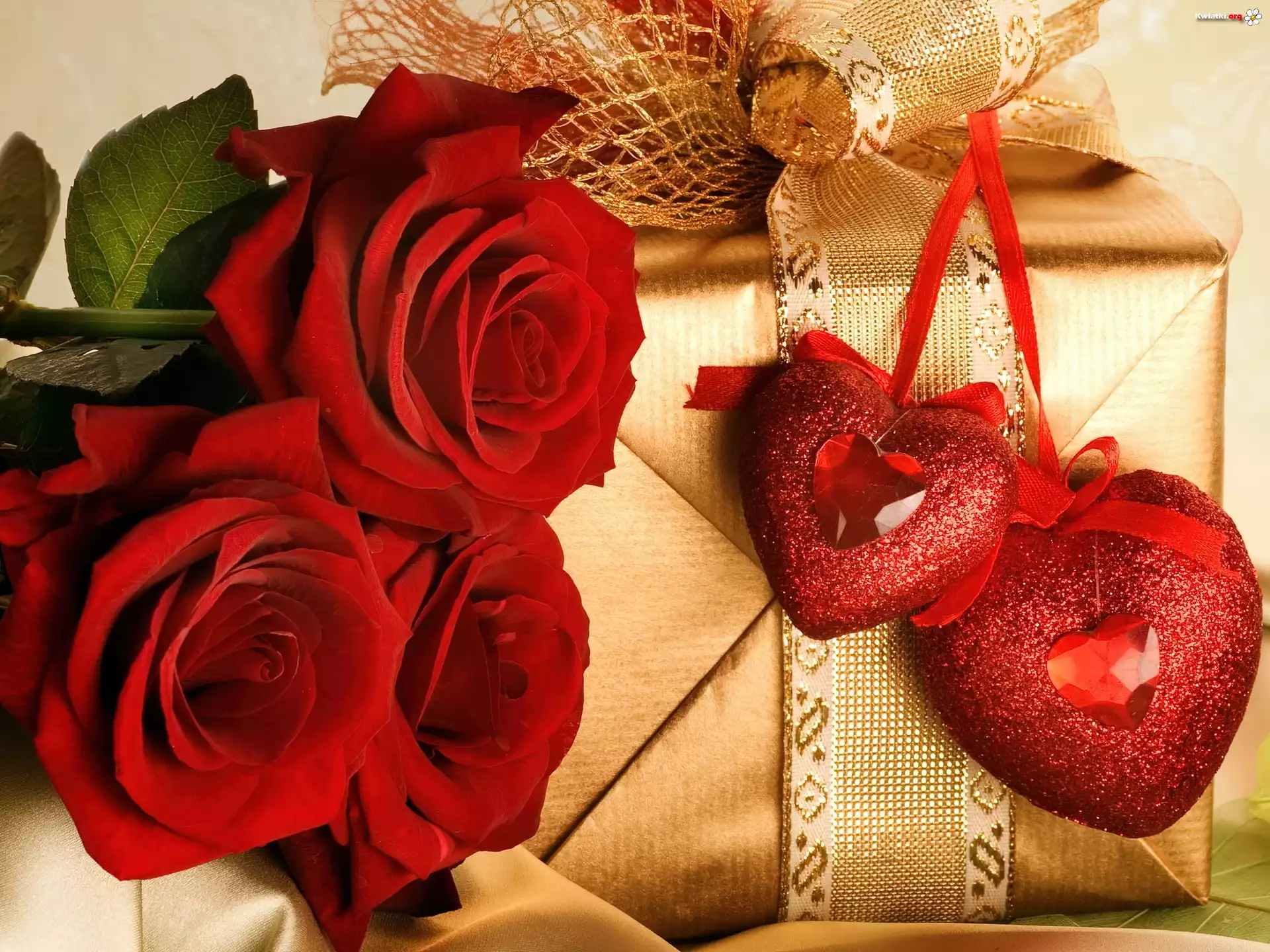 Czerwone, Róże, Prezent, Serca - Zdjęcia