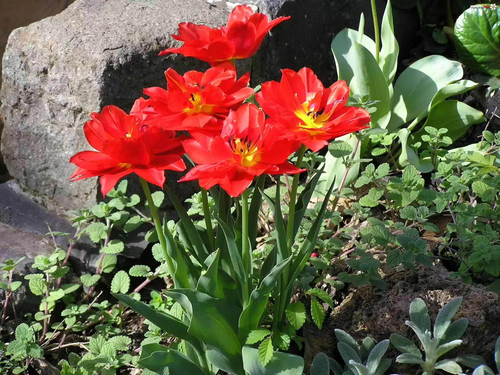 Czerwone, Tulipany, Rośliny, Kamień - Zdjęcia